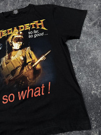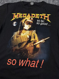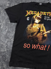 Vintage Megadeth Band T-Shirt So Far! So Good Crazy Print. Good condition. Tagged size M — please check the measurements. Worldwide shipping 1–4 weeks No return/refund More info in dm Shipping from Moldova/Ukraine, not the USA. All customs duties and import taxes are covered by me. Chest 19.69 in 50 cm Length 26.38 in 67 cm Shoulders 17.72 in 45 cm Sleeve Length 7.87 in 20 cm