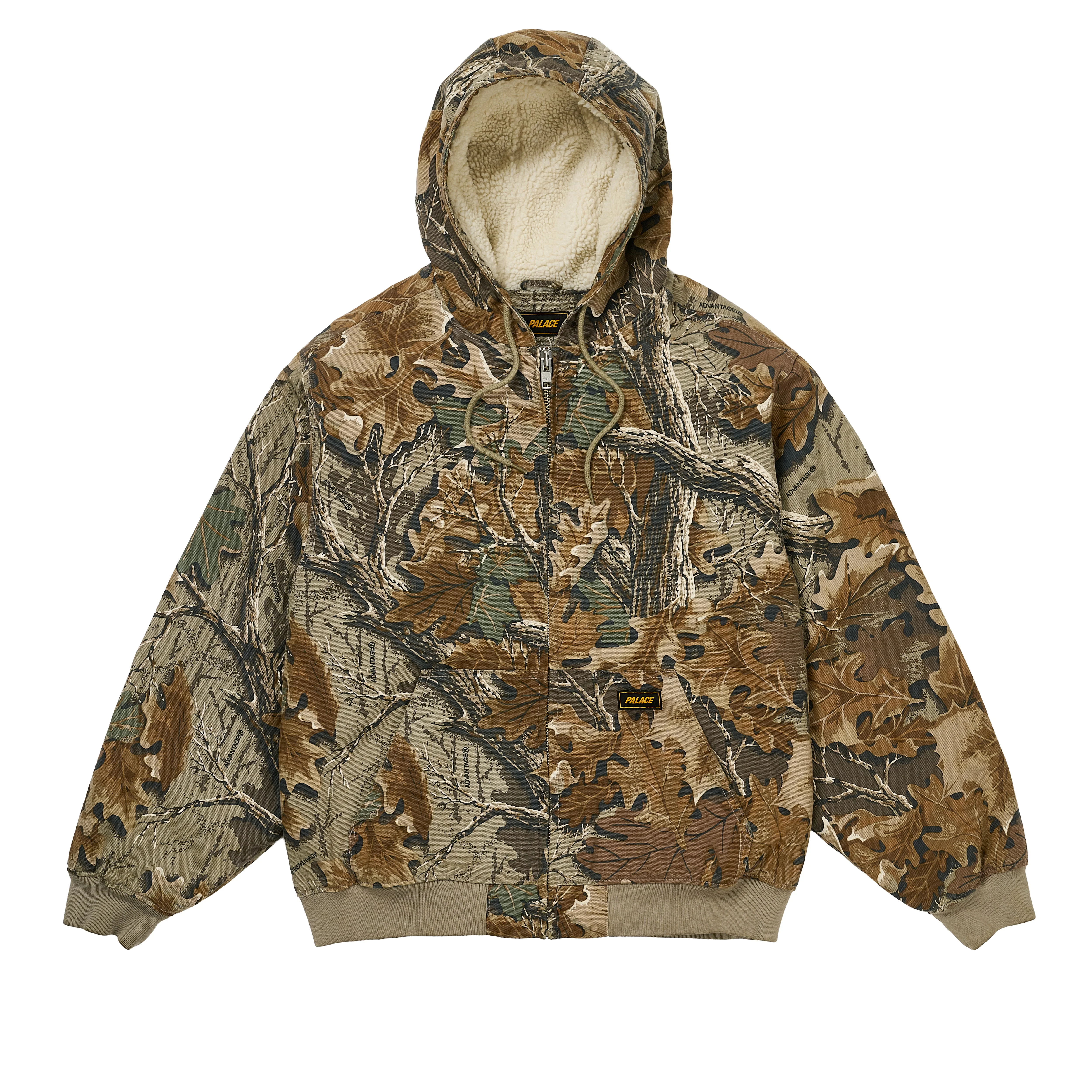 - if you think - palace is spenny - wait till you - grow up - and have to - settle a vet bill TECHNICAL DETAILS - heavyweight cotton canvas realtree advantage® aop - faux sherpa lining - laser bleached back branding - adjustable hood with drawcord - front kangaroo pocket - military woven label - ribbed cuff and hem - shell: 100% cotton, fill: 100% polyester, hood lining: 100% polyester, body lining: 100% nylon, rib: 85.5% cotton, 13.5% polyester, 1% elastane