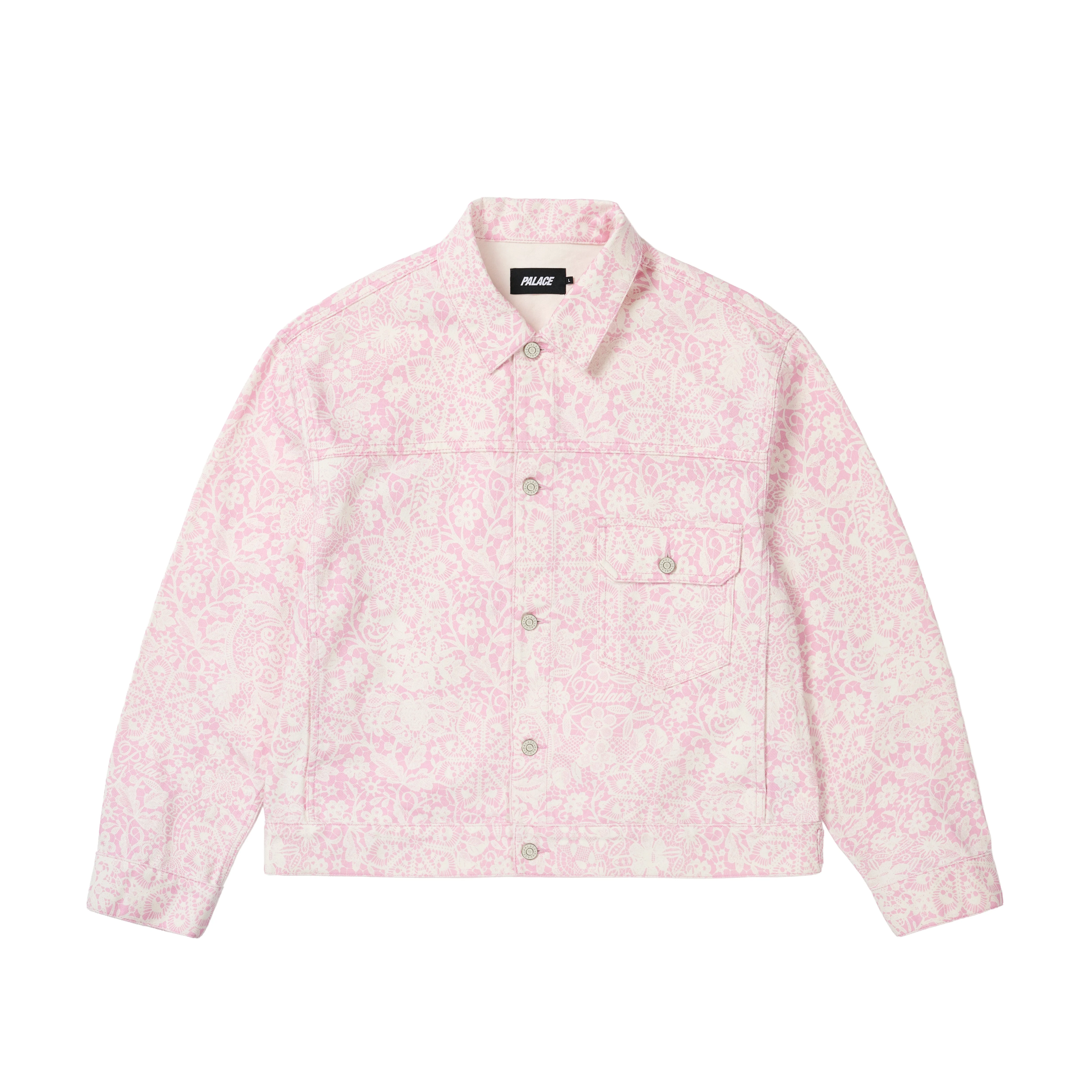 - pink denim - rose wine - i kip it off - in the day time TECHNICAL DETAILS - rinse wash denim jacket - lace printed artwork - tonal stitching - front chest pocket - palace branded metal hardware - palace leather back patch - 100% Cotton