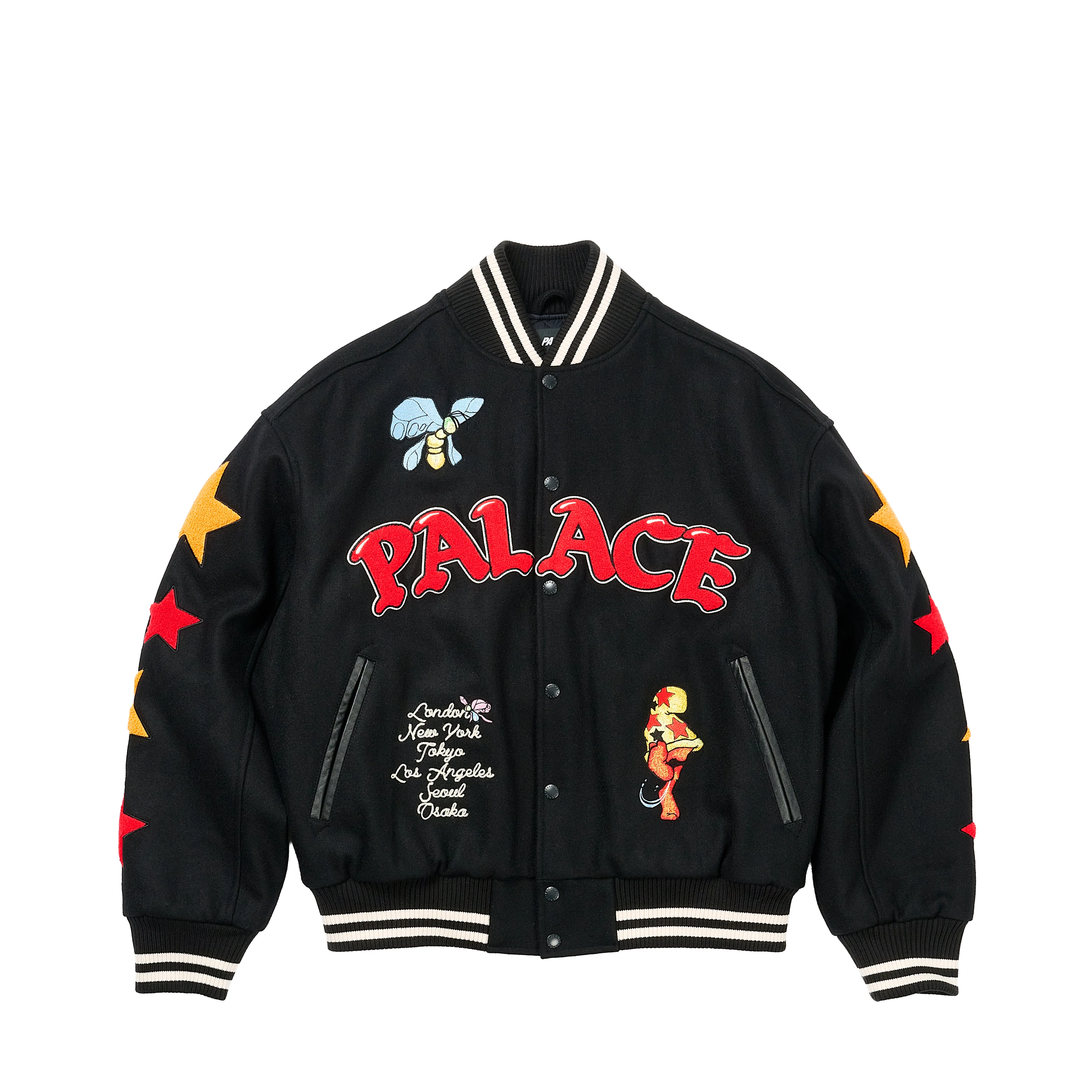 - palace bodē - run das roadie TECHNICAL DETAILS - Mark bodē Artwork - Chenille Palace Branding - Embroidery And Chain Stitch Detail - Side Welt Pockets With Leather Trim - Inner Pocket - Contrast Striped Rib - Ykk® Palace Branded Snaps - Diamond Quilted Lining - Palace Mark bodē Woven Back Neck Label - Shell: 65% Wool, 24% Polyester,5% Polyamide, 3% Viscose, 3% Acrylic, Filling: 100% Polyester, Lining: 100% Nylon - © mark bodē 2025