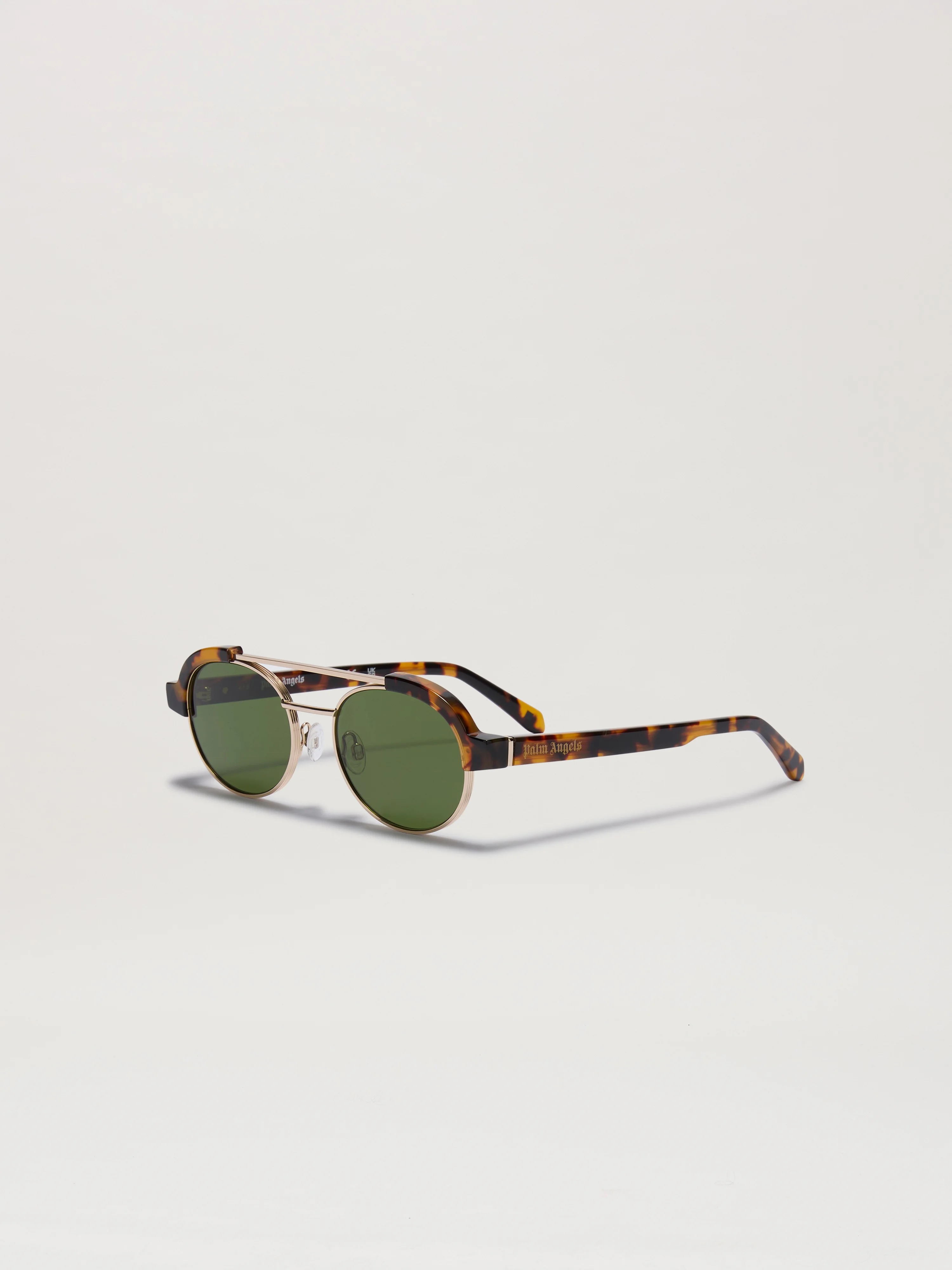 Oval shapes attract metal and are enhanced by acetate details. Golden metal oval frame with havana acetate top and temples with green lenses and Palm Angels logo engraved in white. DETAILS - Material 1 100% Acetate - Code: PERI10CS25PLA0016055