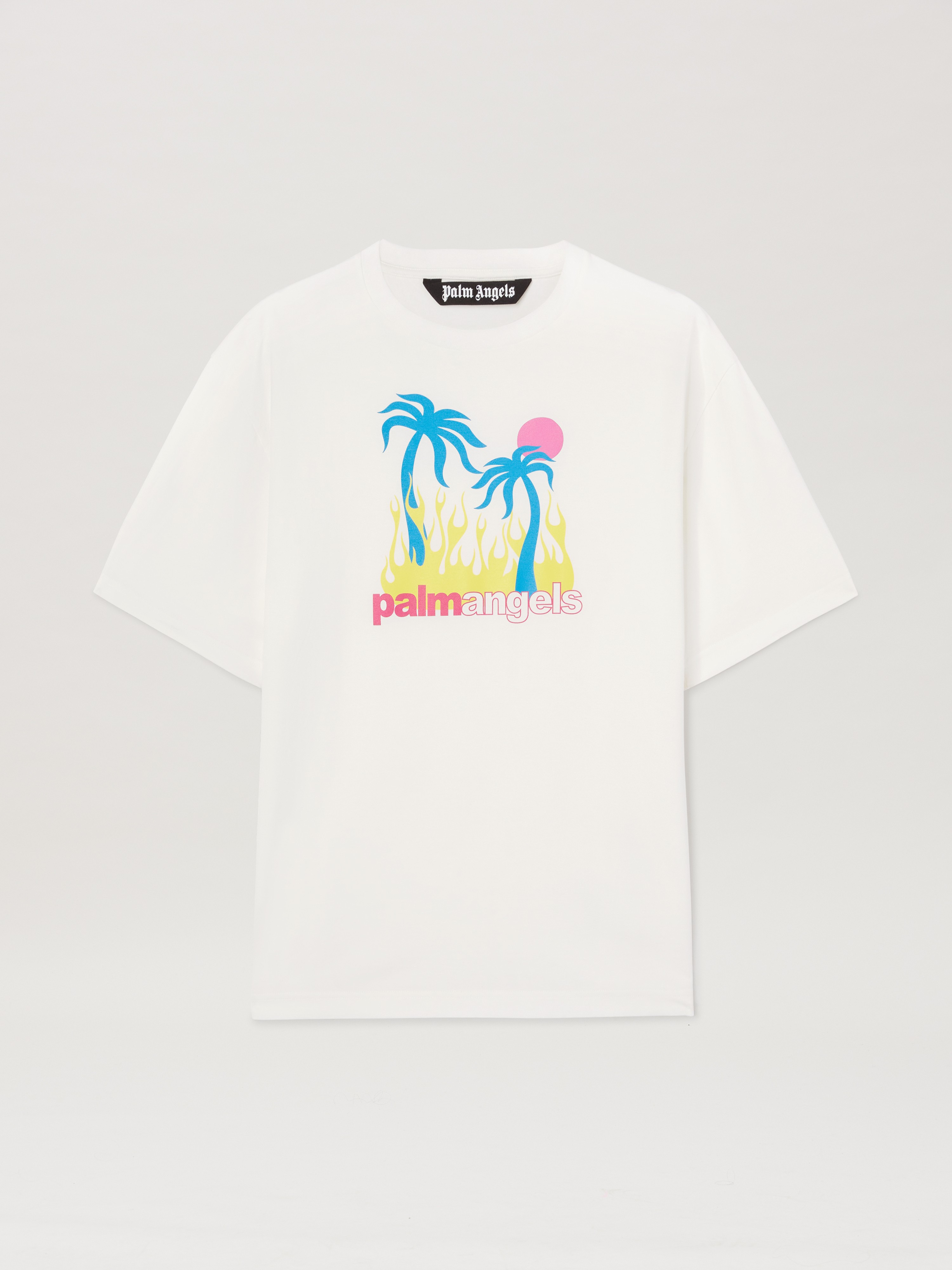 Combining palm trees and flames in a new glossy print. Men's white short sleeves T-shirt with front print of palm tree oasis with sky blue palm trees among yellow flames and with Palm Angels lettering inscribed on bottom. PRODUCT ID: PMAA089S25JER0020384