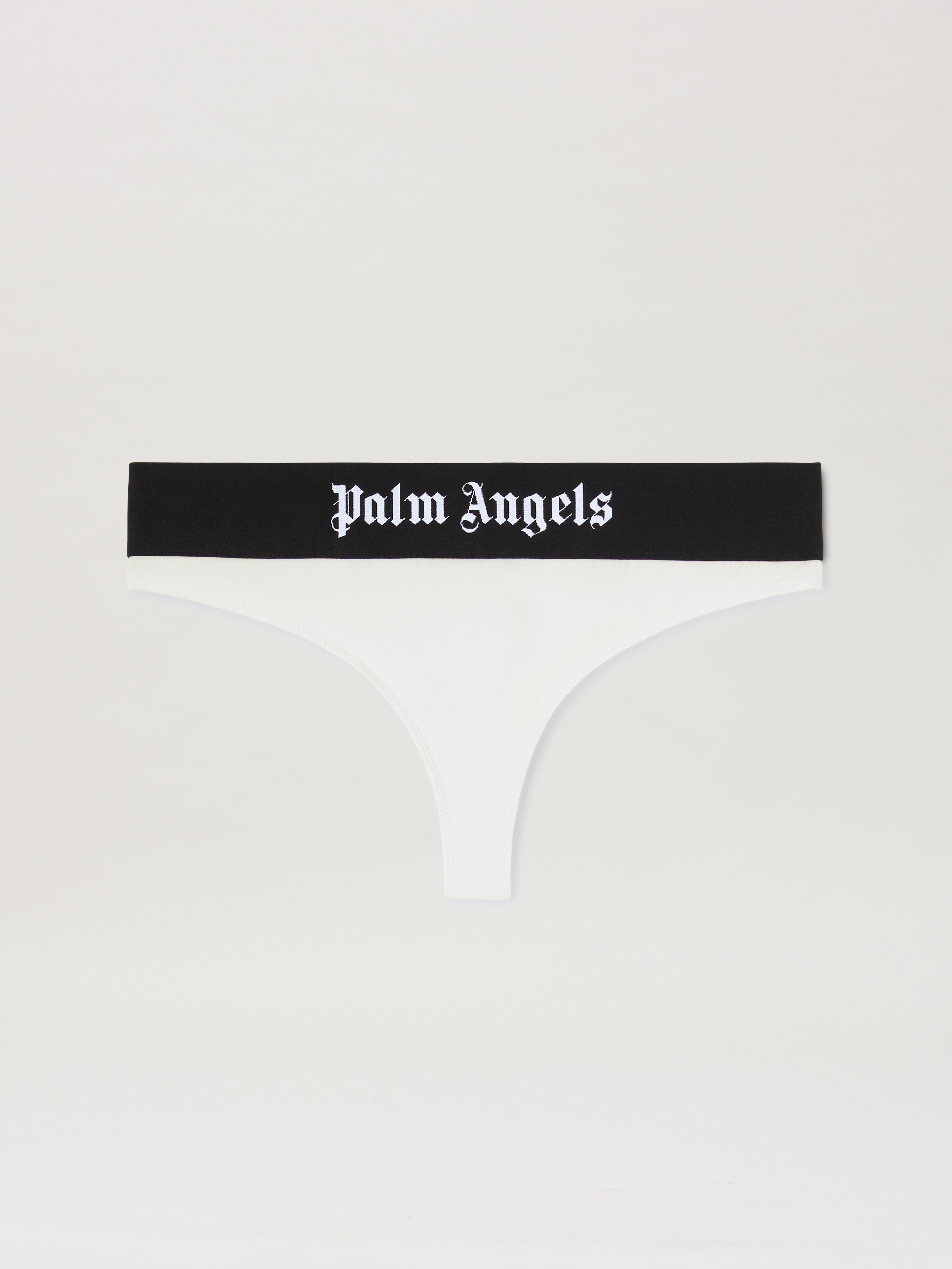 A bold essential with a sleek silhouette. This white thong features a minimal design elevated by the signature Palm Angels logo at the waistband. DETAILS - DETAIL 82% POLYESTER 9% ELASTAN 9% POLYAMIDE - FABRIC 6% ELASTAN 94% COTTON - Code: PWUF002C99FAB0030110