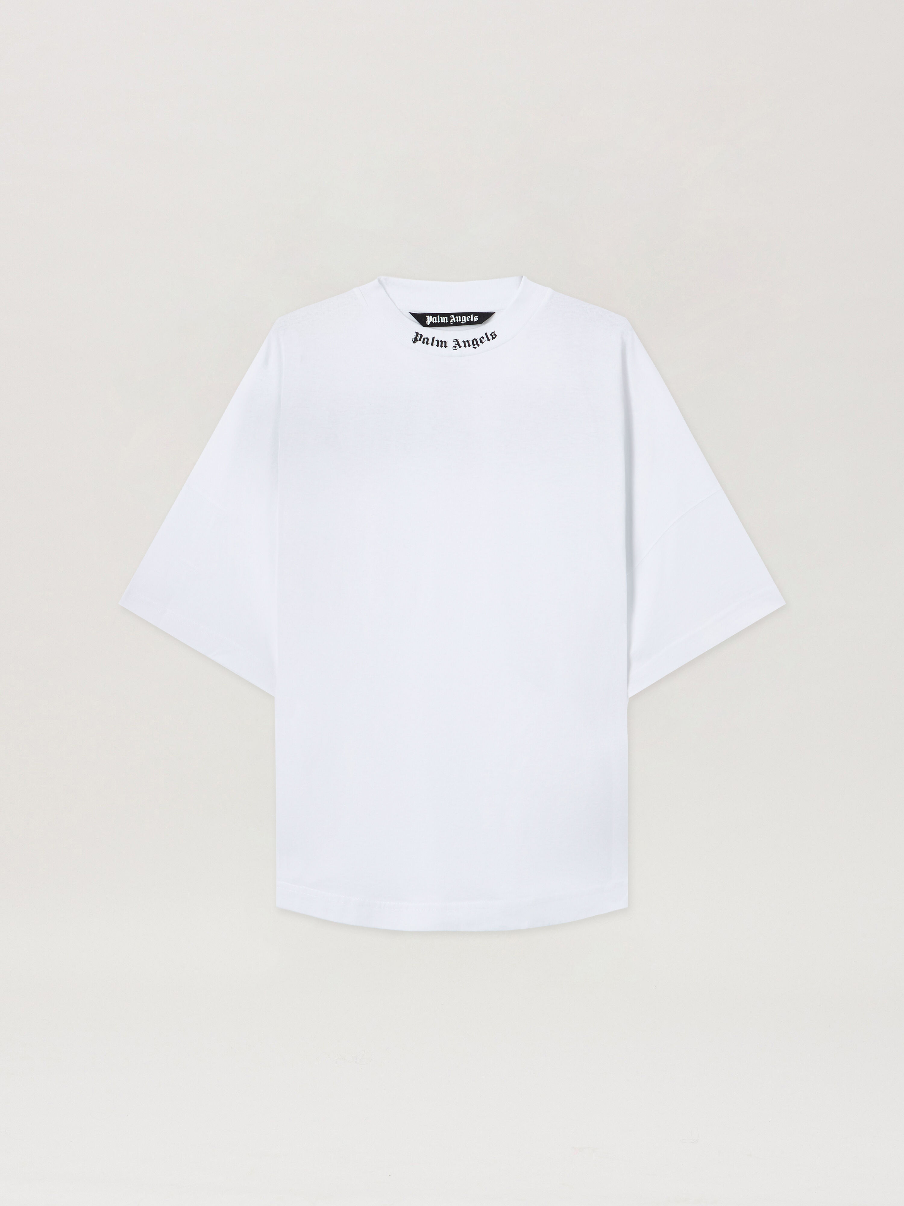 A clean cut with bold identity. This oversized white t-shirt features the palm angels gothic logo at the collar, a streetwear essential with attitude. DETAILS - FABRIC 100% COTTON - RIB DETAIL 100% COTTON - Code: PMAA002C99JER0010110