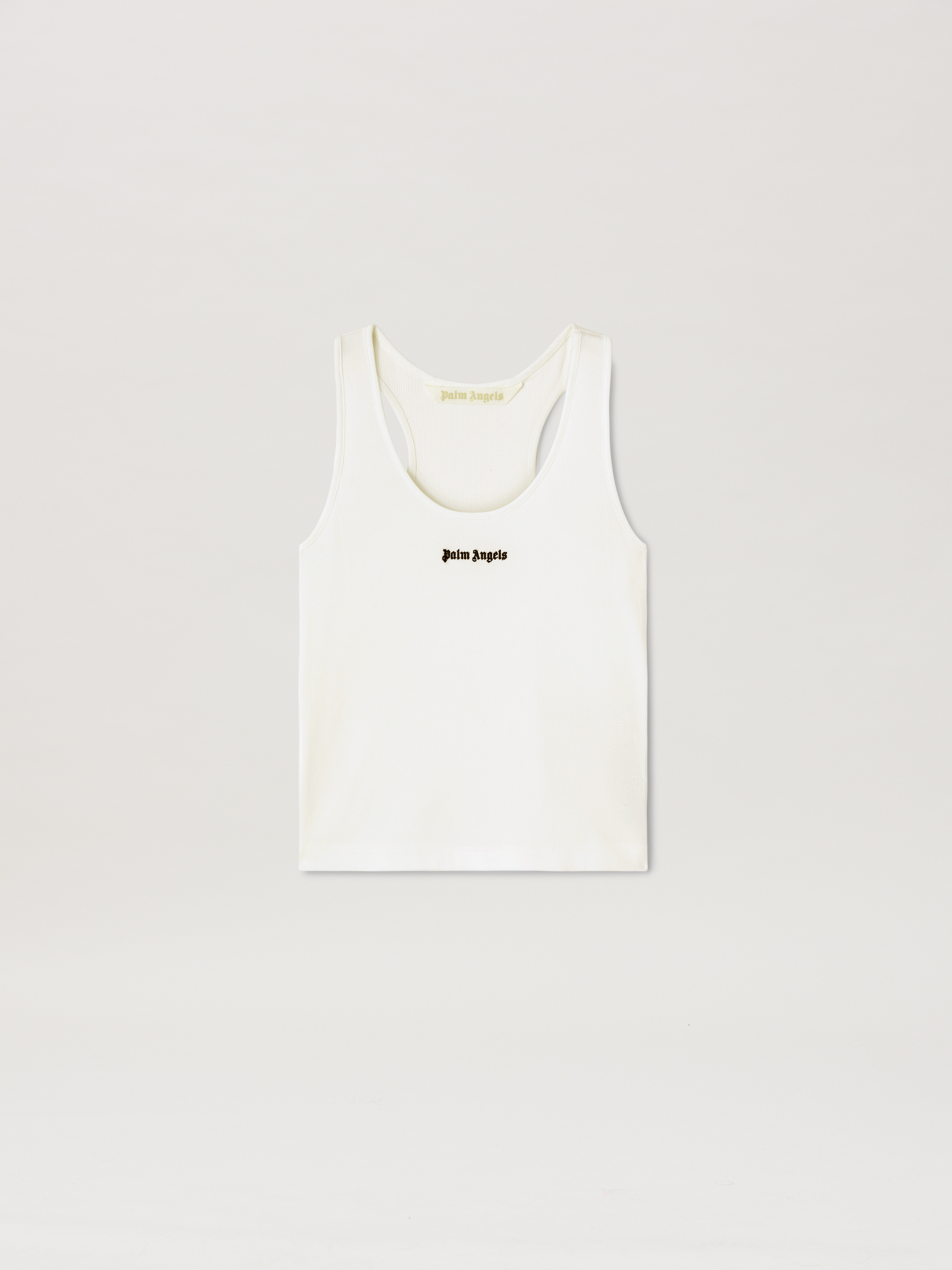 Minimalism meets signature streetwear flair in this Palm Angels Tank Top. Form-fitting with a scoop neckline and racerback silhouette, with brand's iconic Gothic logo embroidered on the chest in contrasting black. DETAILS - EMBROIDERY 100% POLYESTER - FABRIC 7% ELASTAN 93% COTTON - Code: PWAC020C99FAB0010110