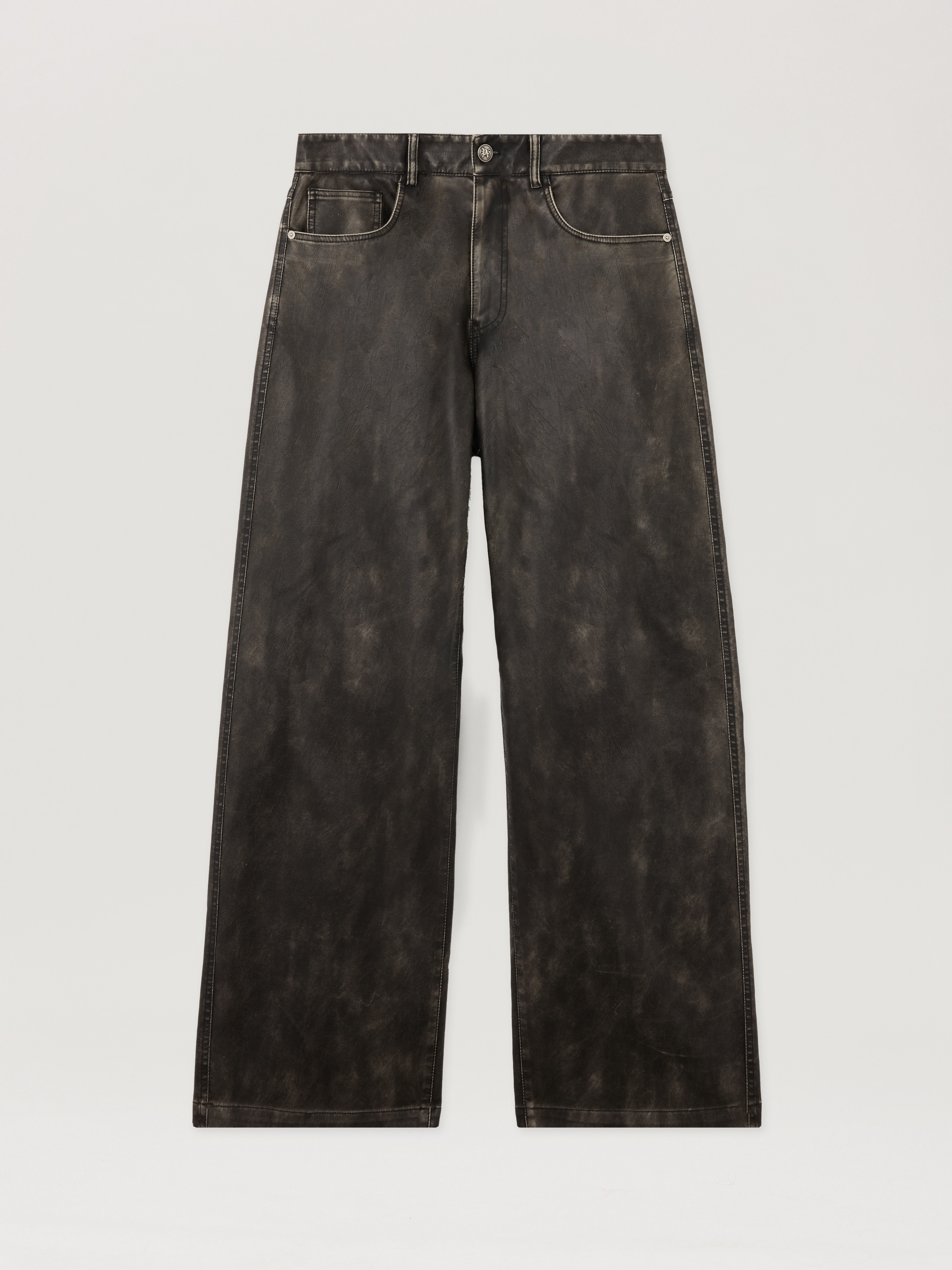 Wide-leg coated pants featuring a curved logo at the back, crafted from a unique texture for a streetwise look. - Wide-leg silhouette - Button and zip fastening - Five-pocket design - Curved logo detail at back - Distinctive coated finish DETAILS - 100% Leather, Fabric: 68% Polyurethane 27% Viscose 5% Altre fibre, Lining: 100% Viscose - Code: PMJB018F25FAB0010710