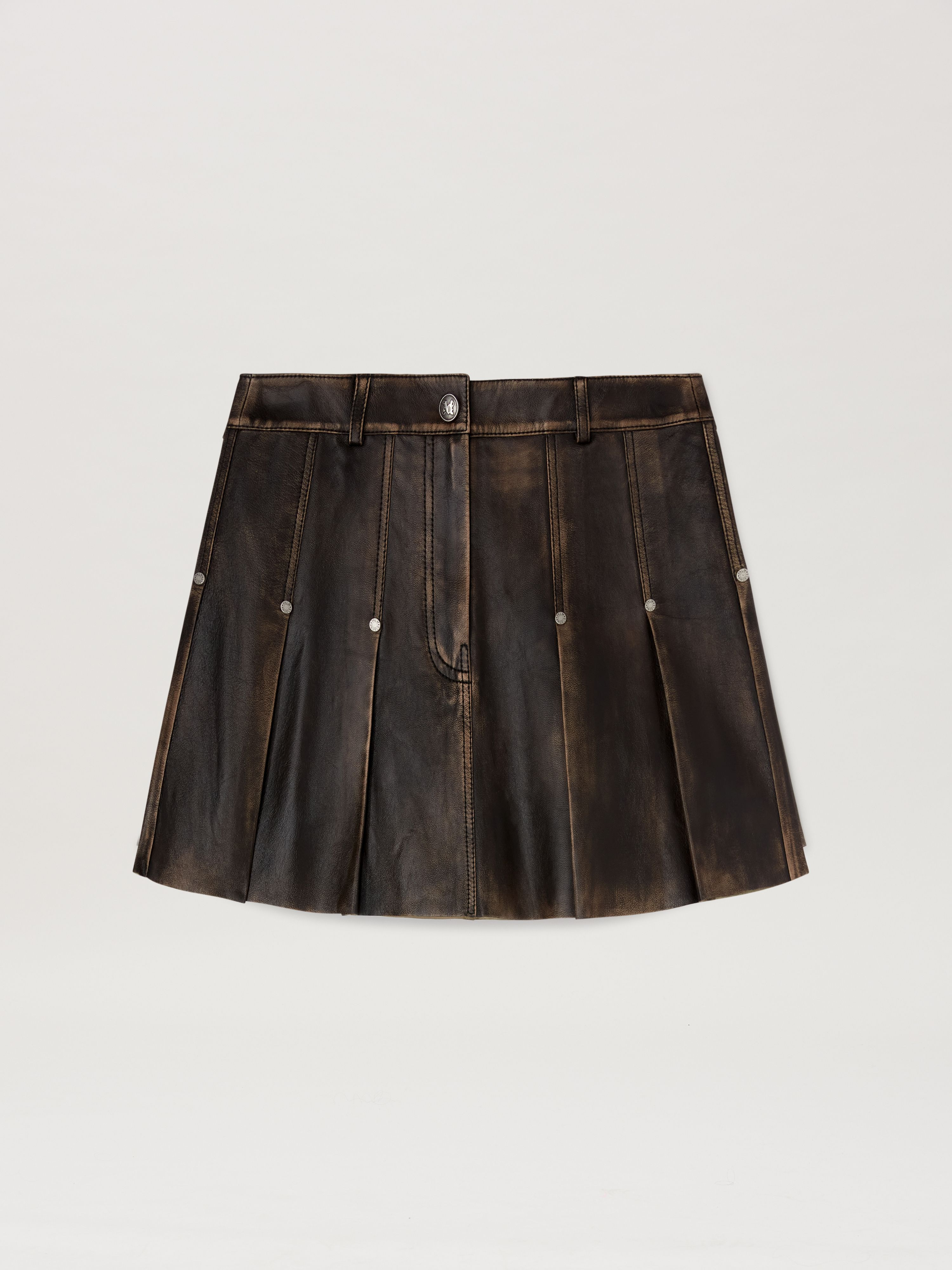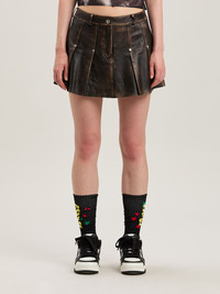 Injecting some street rawness into preppy archetypes. Women's brown leather miniskirt with flat pleats fastened by rivets, and dark brown Curved logo printed on back with a handmade finish. DETAILS - Lining 100% CuproMaterial 1 100% Leather - Code: PWJC011S25LEA001606E