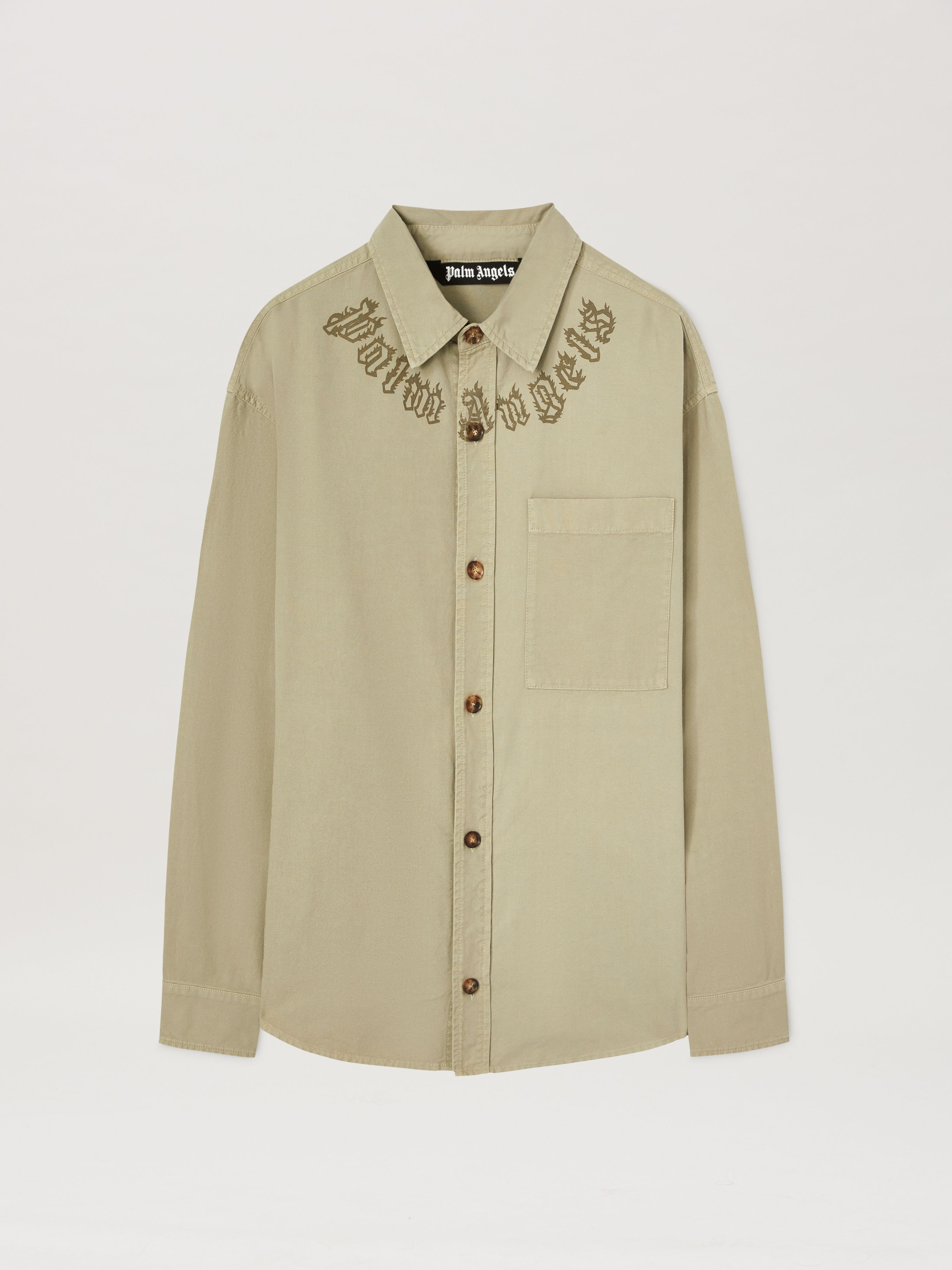 Utility blends with style and the icons of Palm Angels. Men's beige overshirt, with metal button closure, breast pocket and new Neck logo with gothic letters wrapped in spiky flames printed in camel on the front around the neck. DETAILS - Manuel Wears Size 48 Height: 6' 1” (185 Cm) Bust: 34” (87 Cm) Waist: 26” (66 Cm) Hips: 33” (85 Cm) Fabric 100% Cotton - Code: PMES043S25FAB0016262