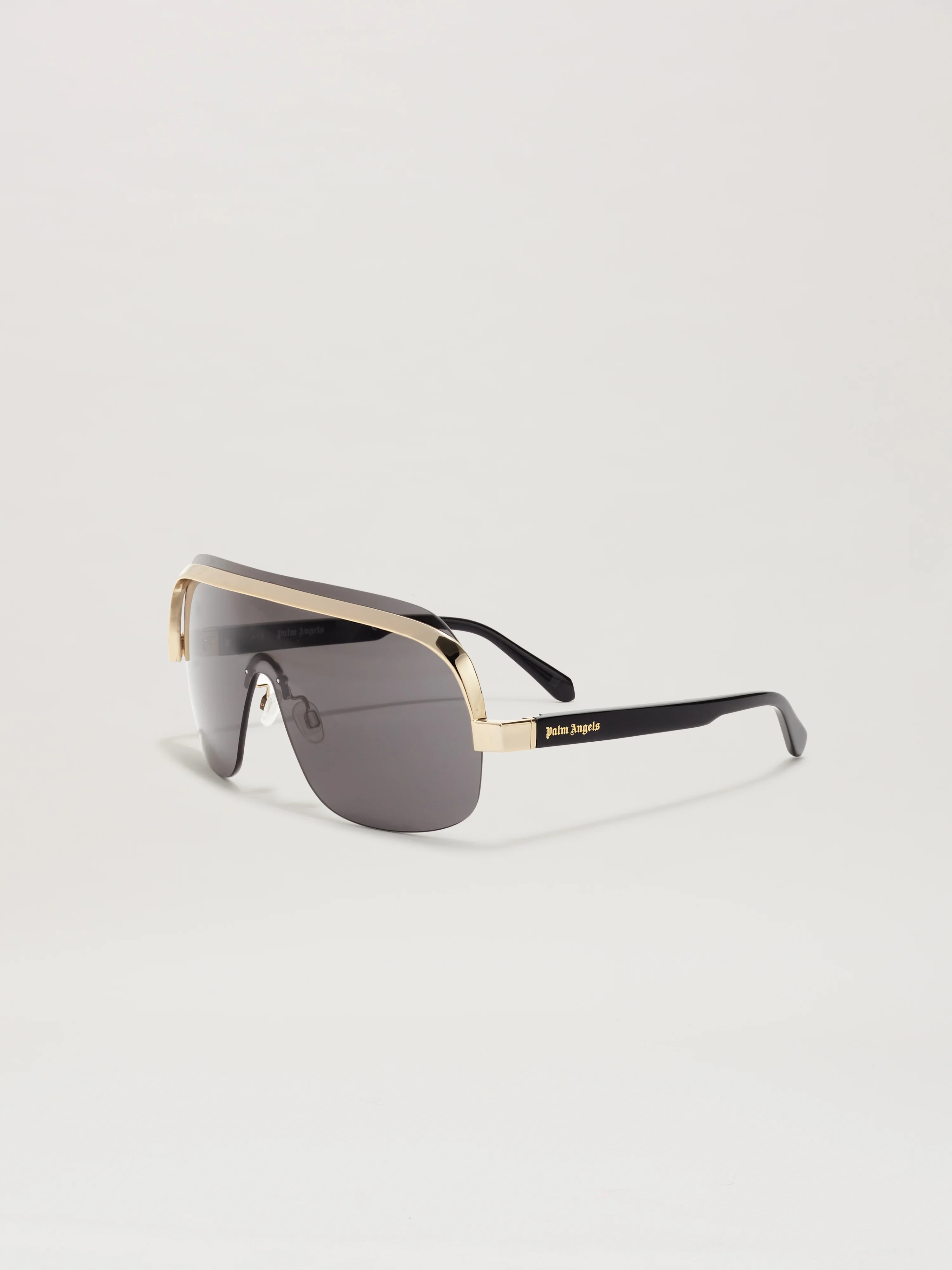 The mask's sporty toughness and the gold metal frame as a style elevator. Mask-shaped sunglasses with dark grey lenses and black acetate and gold metal top frame and thin acetate temples. DETAILS - Material 1 10% Polyamide 20% Metal 70% Acetate - Code: PERI10IS25PLA0011007