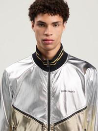 Reflective metallic track jacket with laminated coating featuring ribbed trims and a sleek silhouette. - High-shine laminated finish - Full front zip fastening - Long sleeves with ribbed cuffs - Striped ribbed collar and hem - Signature logo detail on chest DETAILS - 78% Polyester 22% Polyurethane, Lining: 100% Cupro, Rib detail: 96% Polyester 4% Elastan - Code: PMJA046F25FAB0017276