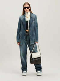 Tailored in features rebellious in essence. Women's loose pants in light blue and white striped denim with laser-made pinstripe effect and with leather label on the back. DETAILS - Detail 100% LeatherFabric 100% CottonLining 100% Cotton - Code: PWYB041S25DEN0014001
