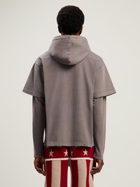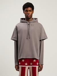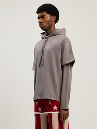 This layered hoodie features a distressed finish with monogram detailing, embodying a raw, streetwise aesthetic. - Distressed finish with monogram detail - Layered design for added texture - Relaxed fit with drop shoulders - Drawstring hood for adjustable coverage - Long sleeves with short sleeve overlay - Durable construction for everyday wear - Ribbed hem and cuffs for a secure fit DETAILS - 100% Polyester, Fabric: 100% Cotton, Fabric: 100% Cotton - Code: PMBB178F25FLE0010610