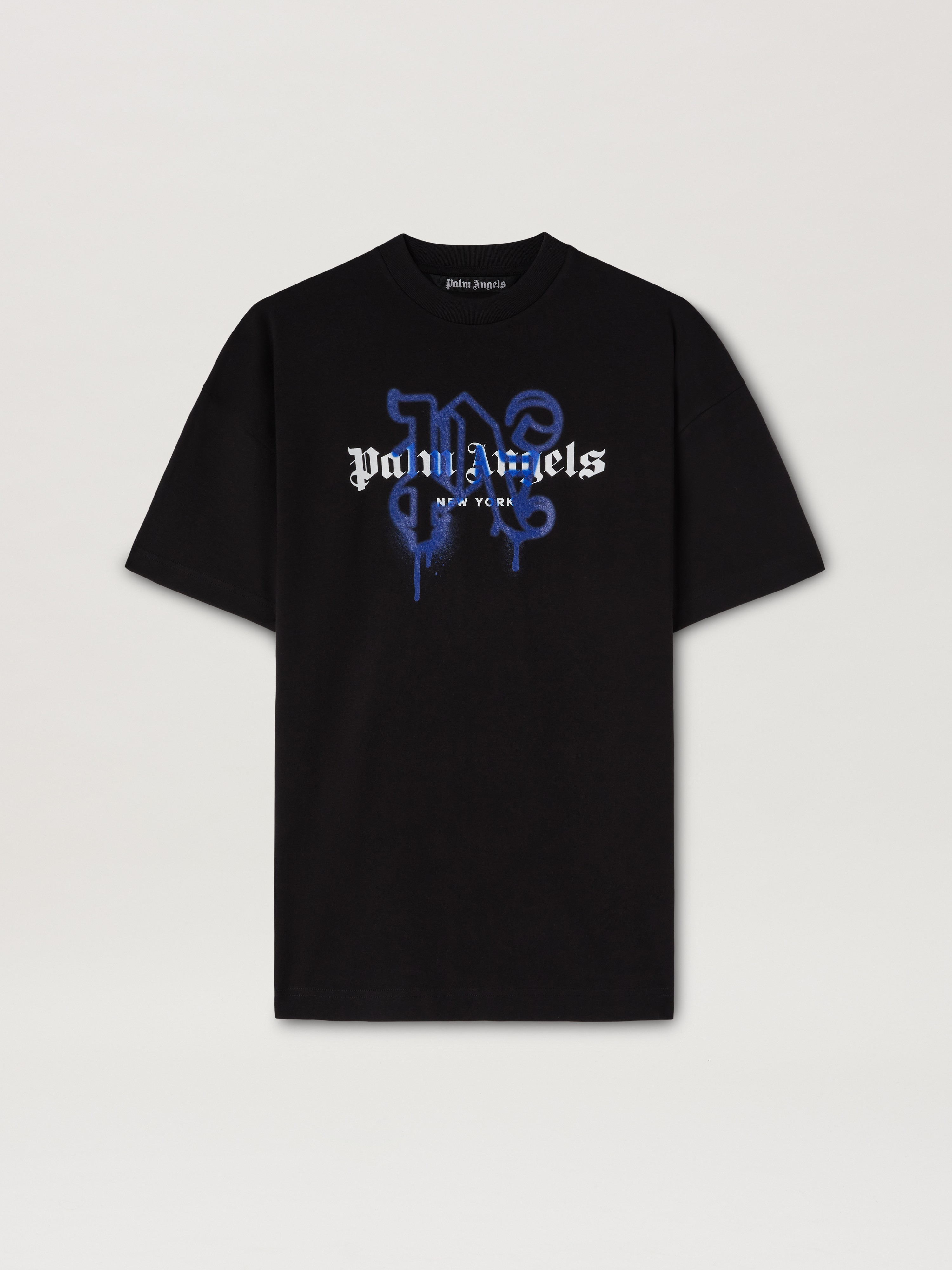 A timeless icon updates its style, the new Spray City T-shirt. Men's black T-shirt with Palm Angels logo and New York lettering printed in white on front and Monogram sprayed on top in blue in a graffiti effect with dripping paint. DETAILS - Fabric 100% Cotton Rib Detail 100% Cotton - Code: PMAA001C99JER0261045