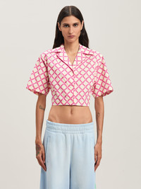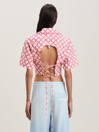 The new pattern of SS25 is a grid resulting by playing with the Classic logo through repetitions and intersections. Women's short sleeves cropped shirt with crisscrossed back, featuring fuchsia Net logo print on ivory background. DETAILS - Detail 100% BrassFabric 100% Cotton - Code: PWGG007S25FAB0010B32