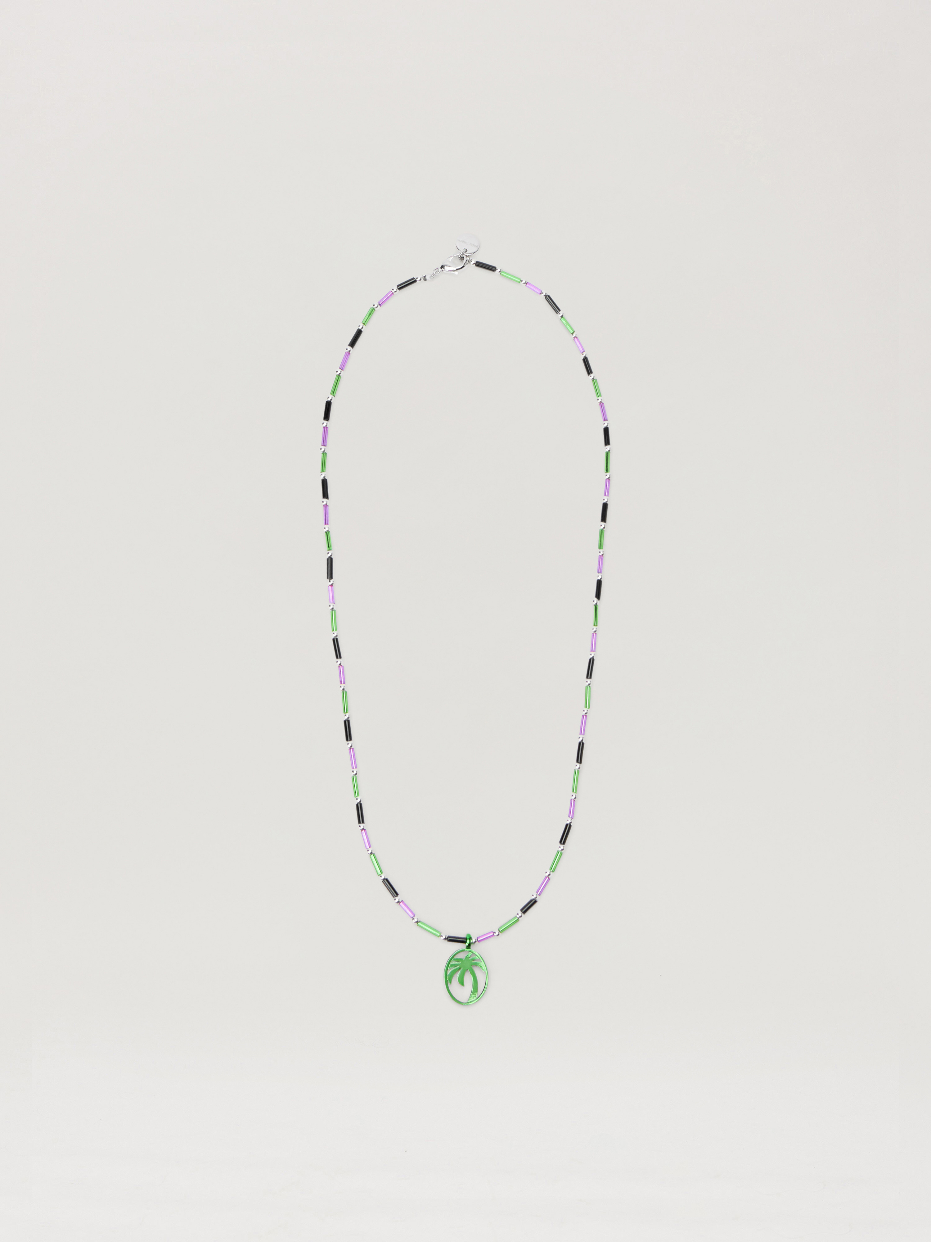 Exquisitely crafted necklace with multicolored beads and a distinctive palm motif pendant. - Features an intricate green palm motif pendant - Composed of multicolored tubular beads - Secure metal clasp fastening - Designed with an alternating bead pattern - Accented with silver-tone spacer beads - Versatile for layered styling DETAILS - 70% Brass 30% Glass - Code: PMOB12IF25MAT0015535