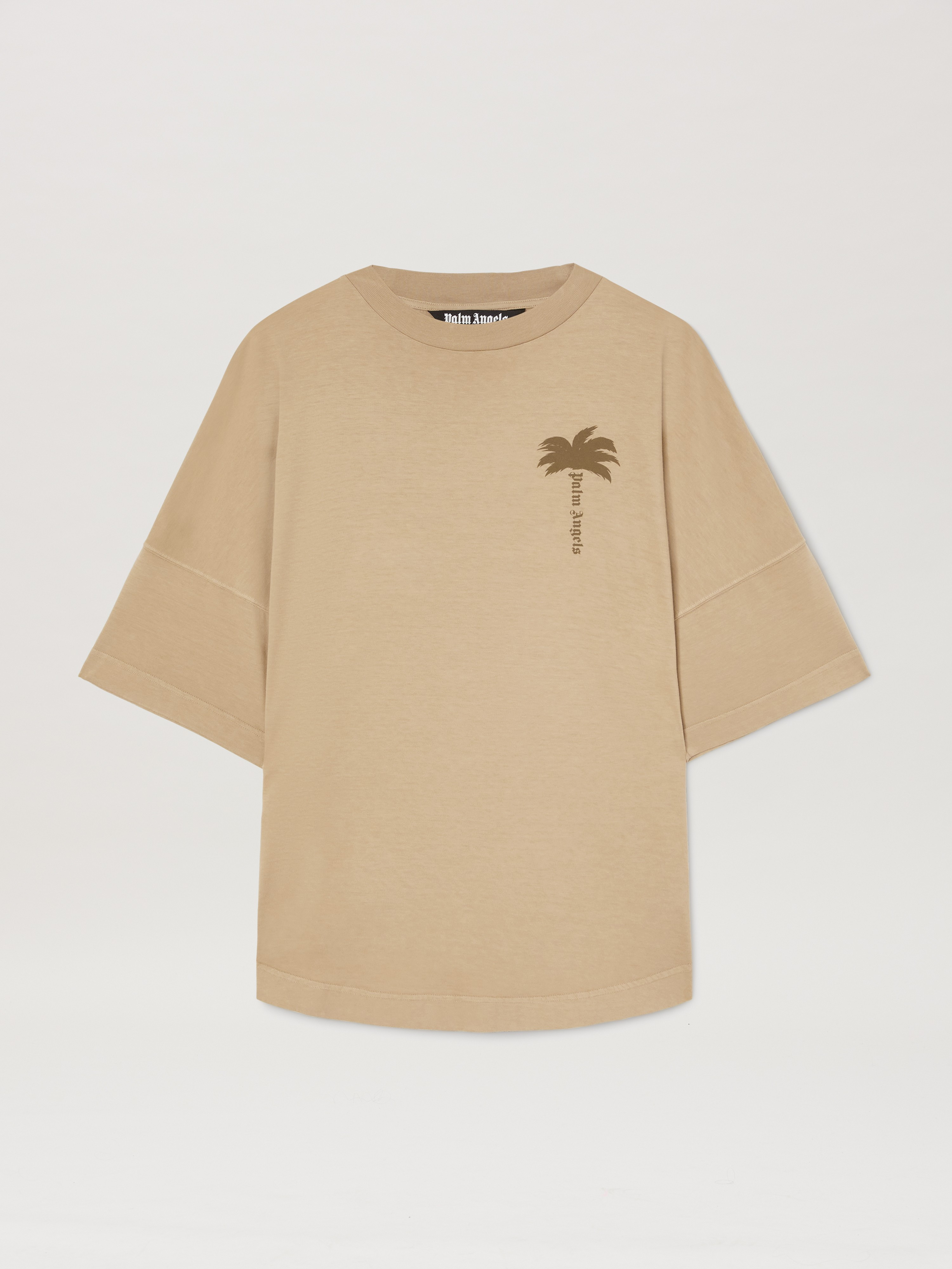 Palm trees blossom in a diversity of styles in the SS25. Men's beige oversize T-shirt with dyed effect featuring tonal Palm logo printed on front and palm tree pattern printed on back. DETAILS - Manuel Wears Size M Height: 6' 1" (185 Cm) Bust: 34" (87 Cm) Waist: 26" (66 Cm) Hips: 33" (85 Cm) Fabric 100% CottonRib Detail 100% Cotton - Code: PMAA002S25JER0046161