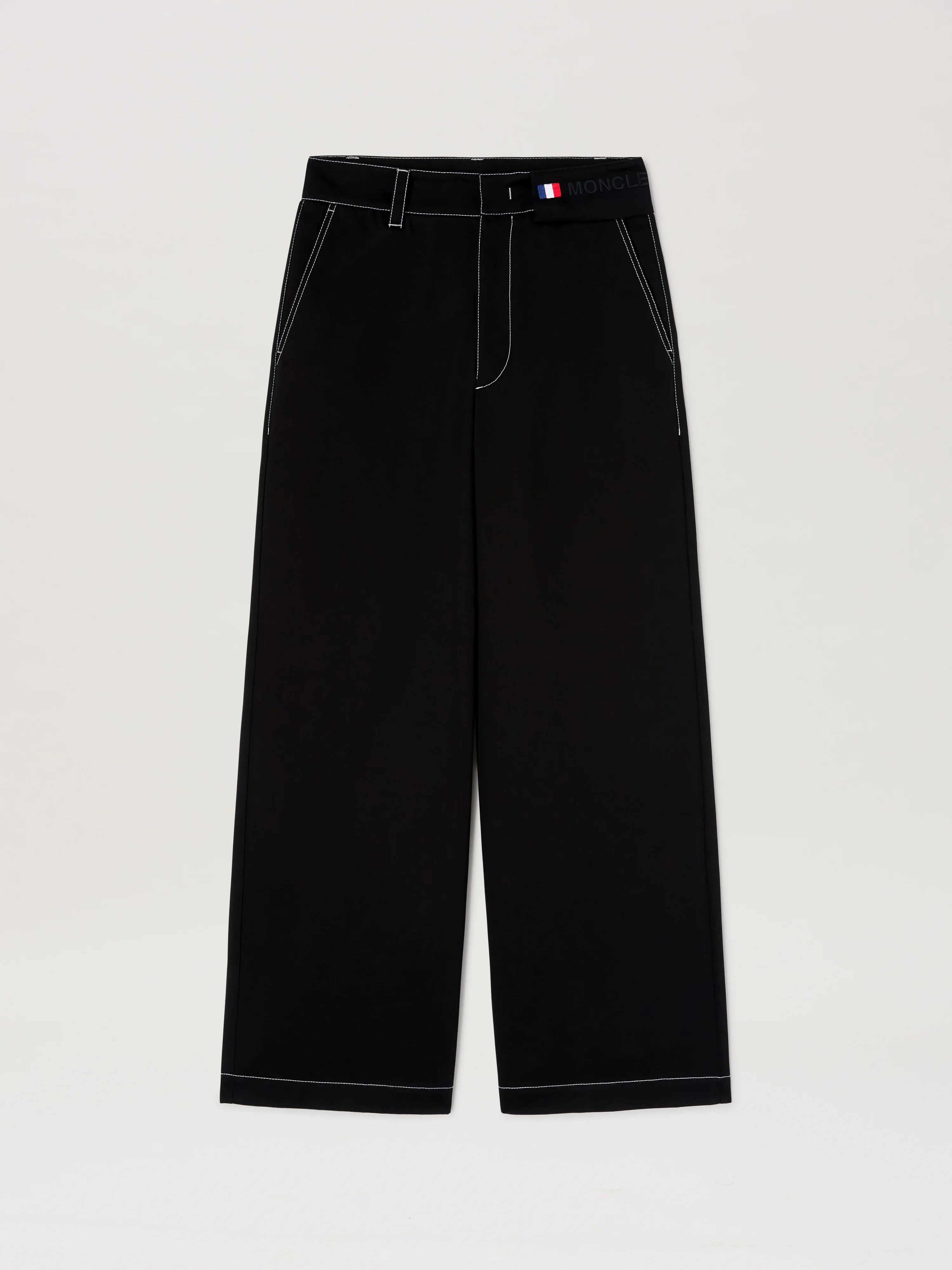 Women's black wide pants with contrasting white stitching on front and back, French flag and Moncler lettering embroidered in black on front and Racing patch applied on back pocket. DETAILS - Fabric 100% Cotton - Code: PWCA159T25FAB0011010