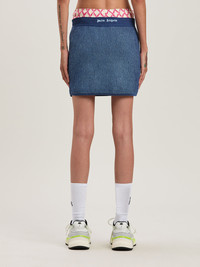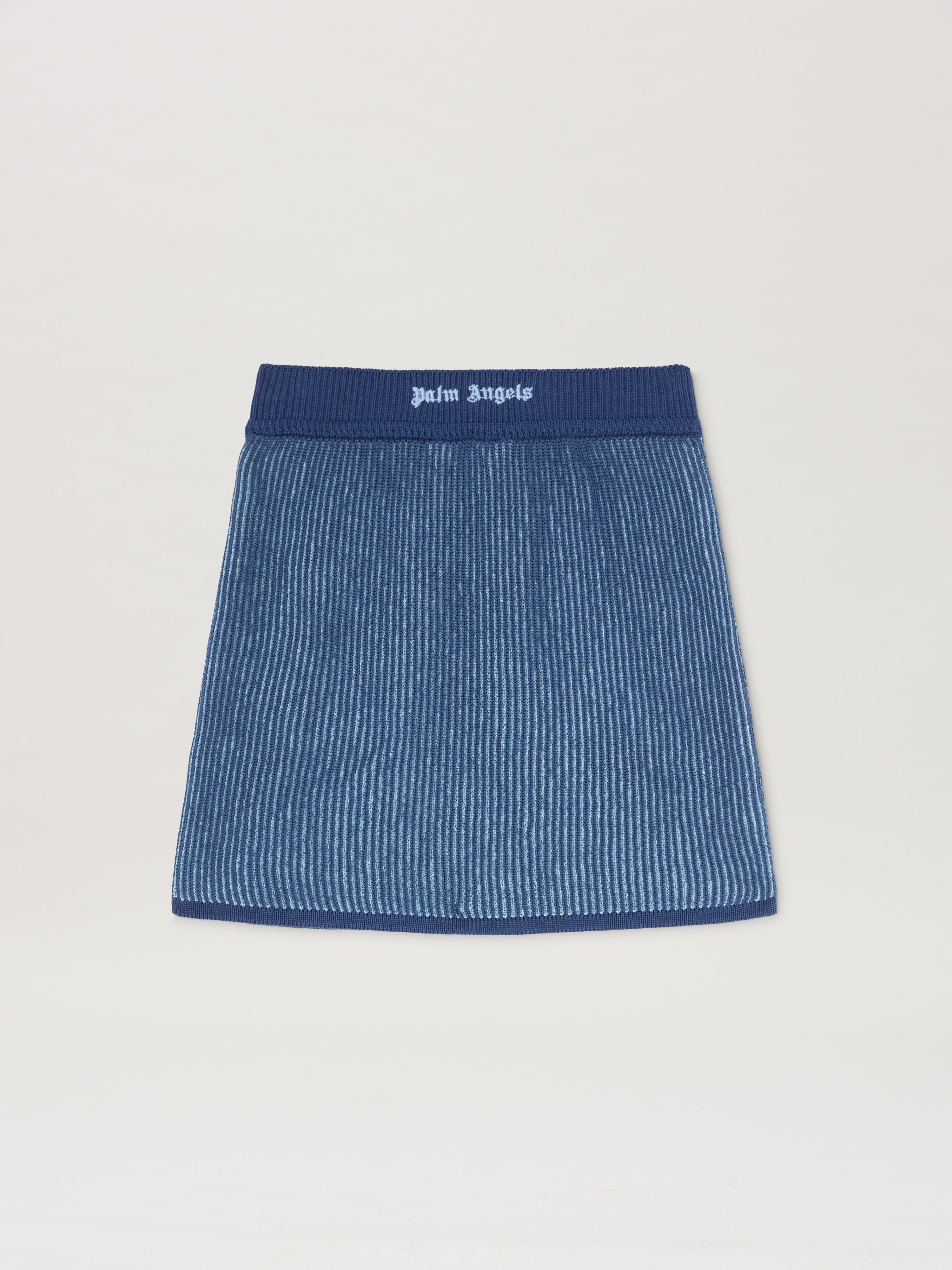 Knitting techniques that transform basic pieces into designer garments. Women's striped ribbed indigo blue and light blue mini skirt with elastic waistband, metal Oval Palm sewn on front and embroidered Palm Angels logo in light blue on back. DETAILS - Renda Wears Size S Height: 5’ 10” (179 Cm) Bust: 30” (77 Cm) Waist: 23” (60 Cm) Hips: 33” (85 Cm) Embroidery 10% Polyester 45% Acrylic 45% WoolFabric 1 100% CottonFabric 2 35% Polyamide 65% Cotton - Code: PWHL014S25KNI0014940