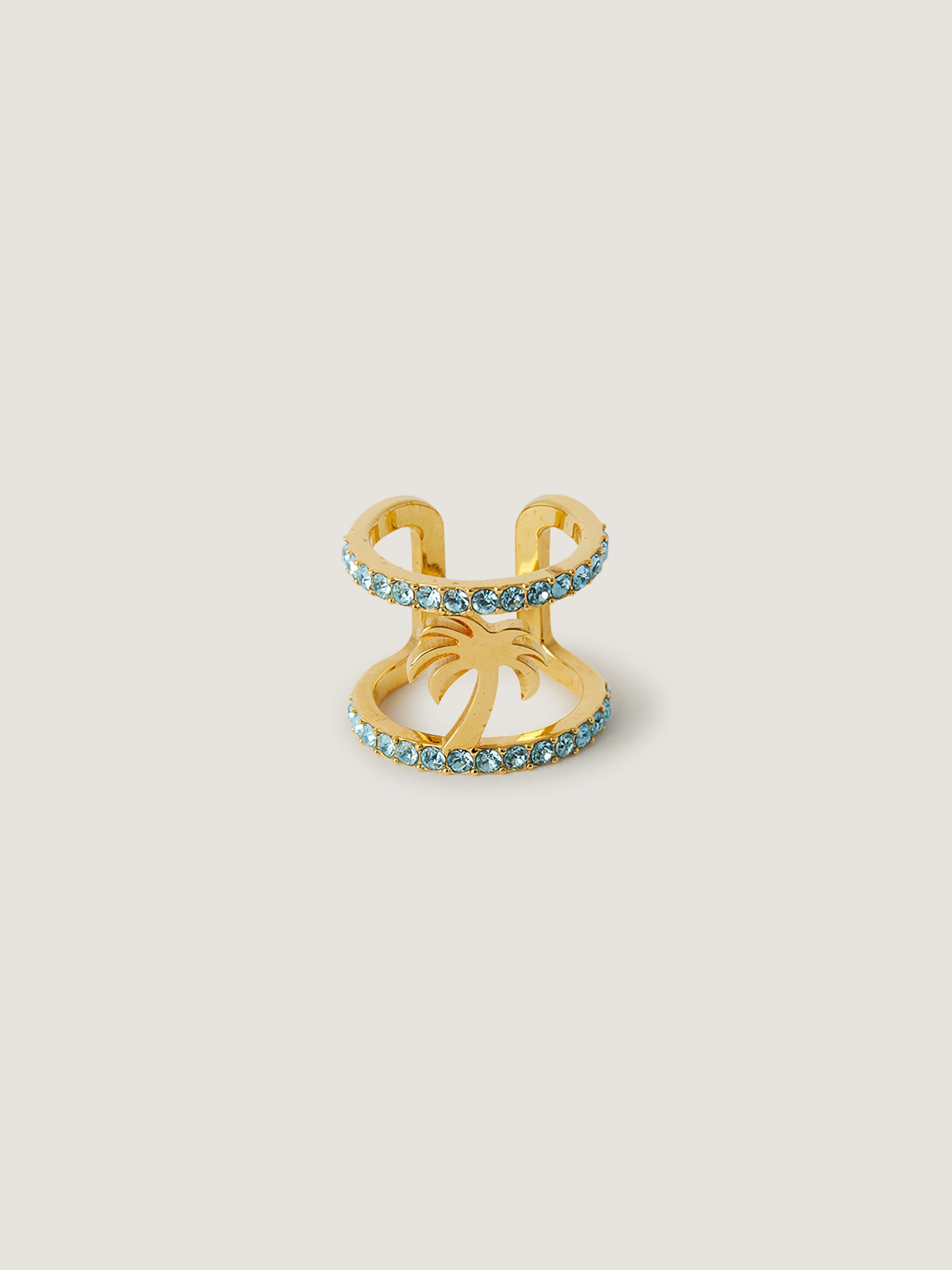 An iconic open band ring adorned with shimmering strass and a distinctive palm tree motif. - Open band design - Embedded strass detailing - Palm tree motif centerpiece - Refined gold-tone finish - Sculptural silhouette DETAILS - 60% Brass 40% Glass - Code: PWOC02CF25MAT0017640