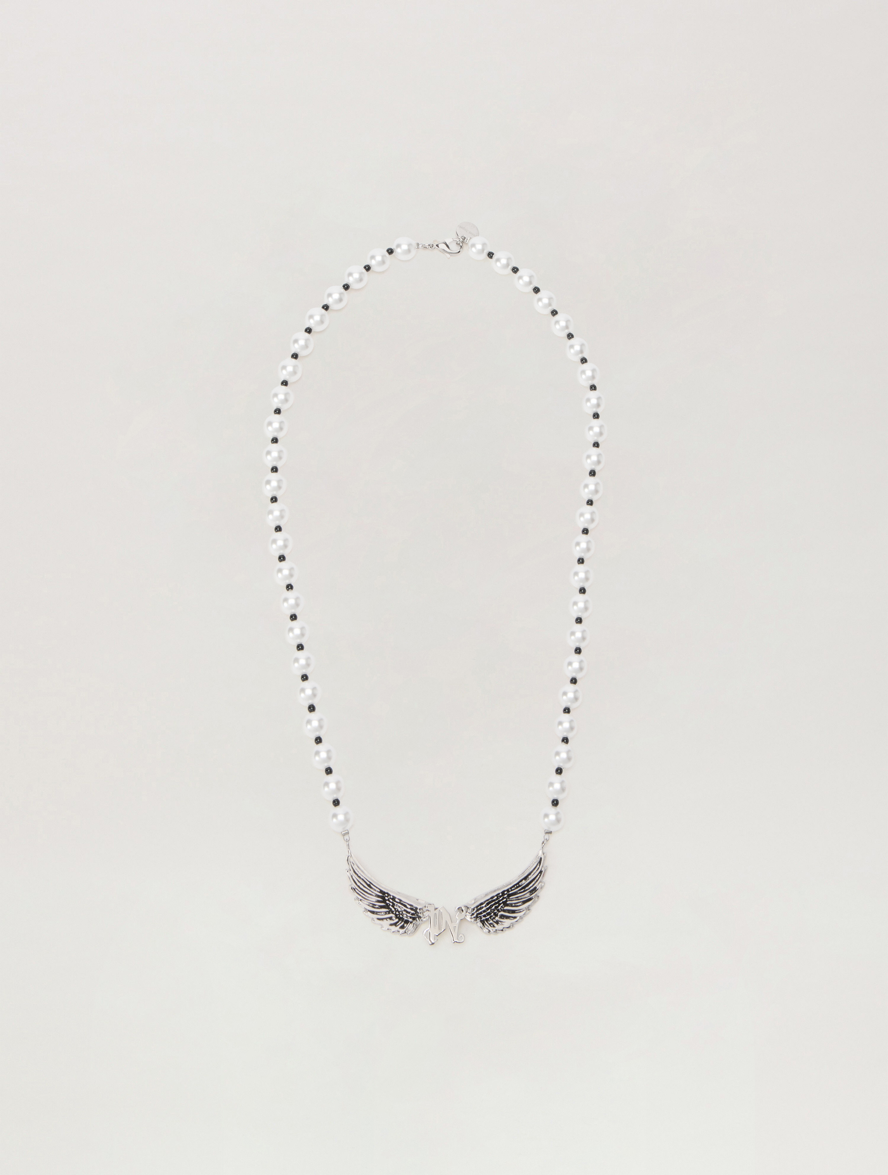 Elevate your style with this exquisite necklace featuring intricate wing details and elegant pearl beads. - Delicate wing pendant centerpiece - Alternating pearl and bead strand - Refined fastening for secure wear DETAILS - 100% Brass, Material: 100% Resine - Code: PMOB12EF25MAT0017203