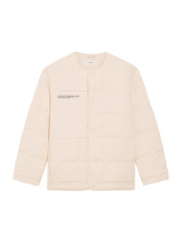 THIS QUILTED COLLARLESS JACKET IS MADE WITH FLWRFILL™, A BREAKTHROUGH WADDING CREATED USING WILDFLOWERS, LYOCELL AND A BIOPOLYMER. THE SMOOTH, MATTE AND QUILTED OUTER SHELL IS 100% RECYCLED NYLON. DEVELOPED IN COLLABORATION WITH IMBOTEX, FLWRFILL™ OFFERS A BIO-BASED ALTERNATIVE TO SYNTHETIC, FOSSIL FUEL-DERIVED WADDING—RESULTING IN A WARM AND MORE LIGHTWEIGHT OUTERWEAR STAPLE.