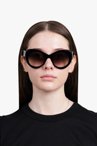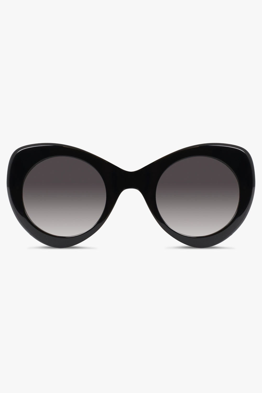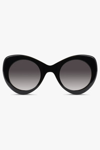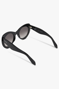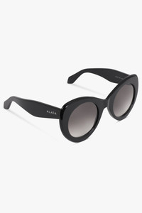 Azzedine Alaia Oval sunglasses feature a shiny solid black recycled acetate frame and gradient grey lens. The couture-inspired embellishments are approached with the highest levels of savoir-faire. Fabrication: 100% Acetate Size and Fit Standard