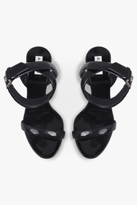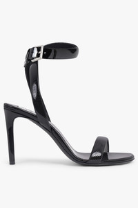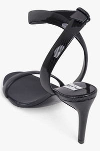 Sophisticated and timeless, the Alaia Ankle Strap Sandals epitomise refined elegance with a sensual silhouette. Expertly crafted in Italy from glossy patent calfskin leather, the design features slender straps that gracefully frame the foot and an adjustable ankle strap for a secure, feminine finish. The patent fabrication is distinguished by subtle ribbed detailing throughout, adding texture and depth to the sleek black finish. Fabrication: 100% patent calfskin leather with subtle ribbed texture Stiletto silhouette with slender straps Adjustable ankle strap for secure fit Covered heel and insole 90mm heel height Pair with a sleek Alaia mini dress or tailored trousers for an effortlessly elegant ensemble.