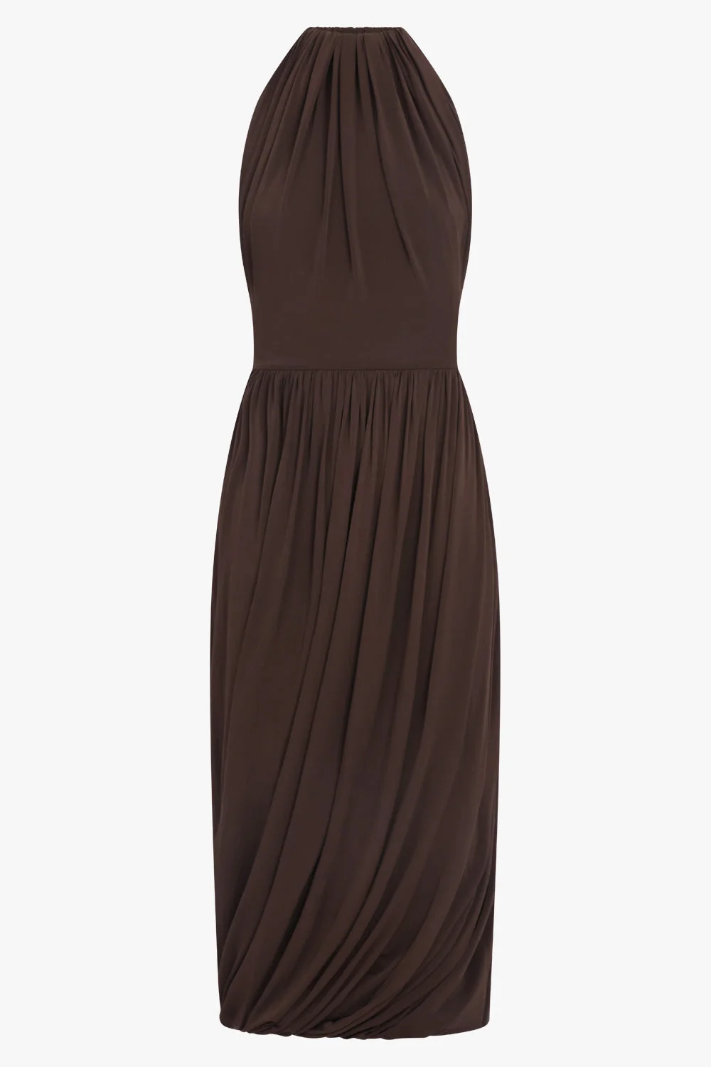 A refined balance of sensuality and ease, the Bodice Sleeveless Twist Dress in Dark Brown is a study in fluid drape and sculpted form. Crafted in soft, unlined jersey, this midi dress features a tulip silhouette that wraps the body with natural movement. The halter neckline and sleeveless cut highlight the shoulders, while the fitted bodice flows into a softly draped midi skirt for an elegant, elongated line. Finished with an invisible zip closure, the deep dark brown hue enhances its understated, modern allure. - Fabrication: 96% Viscose, 4% Elastane - Soft jersey construction with a fluid, draped finish - Tulip silhouette for a sculptural yet feminine shape - Halter neckline with sleeveless design - Fitted bodice that defines the waist - Draped midi-length skirt for effortless movement - Invisible zip closure for a clean, seamless finish Style it with minimalist heels and understated jewellery for an elevated evening look. Size and Fit 36: Bust 60cm, Waist 52cm, Hip 72cm, Length 128cm 38: Bust 64cm, Waist 56cm, Hip 76cm, Length 128cm