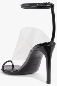 - Fabrication: - 100% Lambskin, - Sole: 80% Calfskin 20% Rubber, - Upper material: 90% Polyurethane 10% Calfskin leather - Asymmetrical heel sandals - Thin asymmetrical leather toe strap, - Large transversal plexi strap and leather ankle strap on the right - foot - Calfskin with transparent polyurethane Size and Fit Heel Height: 90mm French sizing Fits true to size