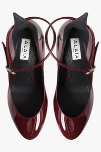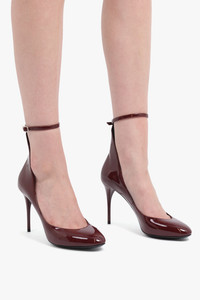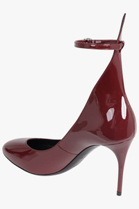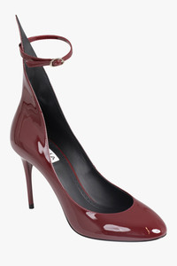 - Fabrication: 100% Calfskin Leather - Patent Leather - Heel pumps - Elegant front low cut and exaggerated pointy back - Ankle strap Size and Fit Runs slightly small, recommend sizing up French sizing Heel height: 90mm