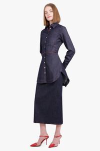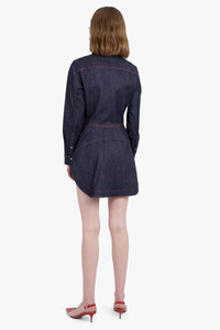 The AlaIa Denim Mini Shirt Dress is crafted in a dark wash stretch denim. The style features a shirt style neckline and full length button closure. The style has long cuffed sleeves and is fitted to the waistline, with a slight a-line flare finish to the mini hemline. Fabrication: 90% Cotton, 2% Elastane, 8% Polyester Size and Fit Sophie: Model is 179cm/5’10” and is wearing a size FR36 Model Measurements: Bust: 76cm, Waist: 61cm, Hips 87.5cm Fits true to size Measurements 36: Bust 86cm, Waist 68cm, Hip 80cm, Length 79cm 38: Bust 90cm, Waist 70cm, Hip 84cm, Length 79cm