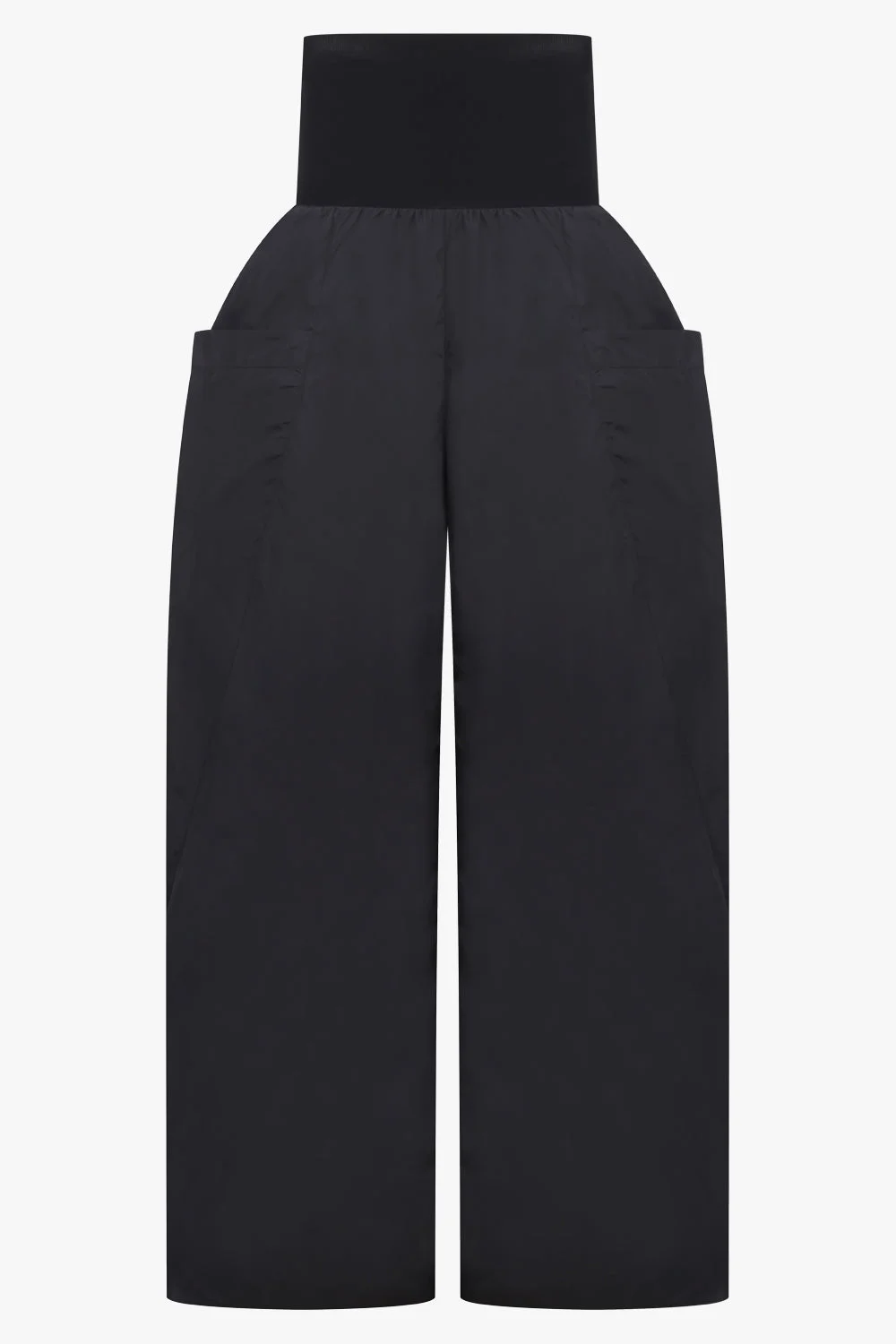 A refined take on modern sportswear, the High Rise Drop Pocket Pant With Waistband in Black blends relaxed functionality with elevated polish. Crafted in shiny nylon, these track pants feature a wide-leg silhouette that moves effortlessly with the body. The high-rise fit is anchored by a ribbed waistband, offering comfort and structure in equal measure, while side drop pockets add a utilitarian edge. Finished in classic black, the design balances ease and sophistication for everyday wear. - Fabrication: 100% Polyamide - Shiny nylon construction with a sleek, modern finish - High-rise silhouette for a flattering, elongated line - Wide-leg cut for relaxed movement and comfort - Ribbed waistband providing structure and ease - Side drop pockets for functional, utilitarian detail Style it with a fitted knit or oversized outerwear for an elevated off-duty look. Size and Fit 34: Waist 56cm, Hip 84cm, Length 114cm 36: Waist 60cm, Hip 88cm, Length 114cm