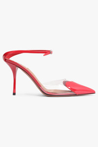 The Alaia Le Coeur Pump is crafted from polyurethane and calfskin leather and features a pointed toe with the iconic heart shape and a thin heel strap with a buckle fastening. The shoe has a thin heel and logo on top of inner sole. The heel height is 90mm. Fabrication: Main: 100% Lambskin Leather Additional Materials: 100% Polyurethane, 100% Calfskin Leather Sole: 95% Calfskin Leather, 5% Rubber Size and Fit Fits true to size French sizing Heel Height is 90mm