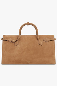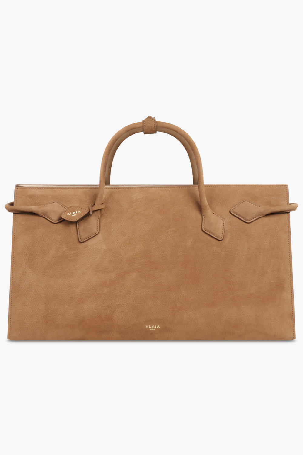 This tote is crafted from supple nubuck calfskin leather, offering a soft touch and refined matte finish. Designed in an elongated East West silhouette, it highlights Alaia’s signature geometric lines and intricate folding technique. Tubular top and side handles add a distinctive sculptural detail, while the generous size makes it an elegant yet functional piece for everyday carry. - Large East West tote bag with signature geometrical details - Intricate folding technique with distinctive tubular top and side handles - Signature folding detail on the bottom of the bag - Tubular handles for hand carry - Finished in supple nubuck calfskin leather for a soft feel - Fabrication: 100% Calfskin Leather - Product comes with signature Alaia dust bag Pair this sophisticated tote with sharp Alaia tailoring or a flowing dress for a modern balance of structure and ease. Measurements Length 42 cm x Height 23 cm x Depth 17 cm