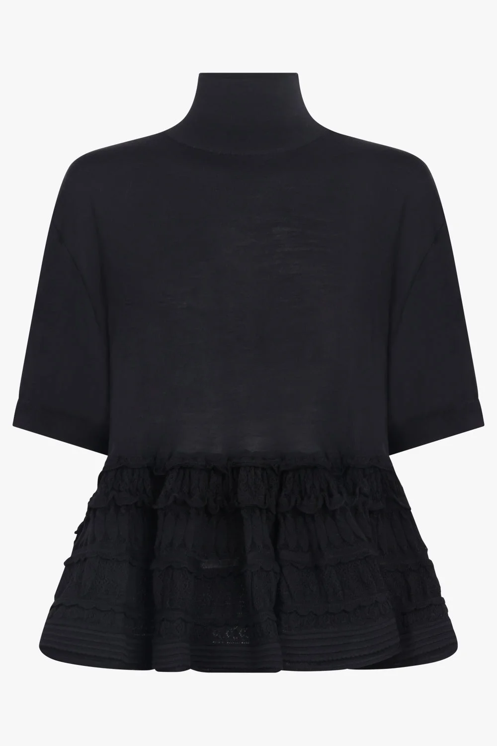 A sculptural take on everyday knitwear, the ALAIA S/S High Neck Peplum Top in Black embodies the House’s signature precision and femininity. Knitted in wool crinoline, this short-sleeve top features a loose, fluid silhouette contrasted by a structured high neckline. The softly flared peplum hem introduces movement and volume, finished with a delicate ruffle that enhances its architectural shape. Ribbed detailing at the neckline adds subtle texture, grounding the piece in refined craftsmanship while maintaining an effortless ease. - Fabrication: 100% Virgin Wool - High neck design with ribbed neckline for a clean, sculptural finish - Short sleeves with a relaxed, loose-cut silhouette - Peplum shape with ruffled hemline for fluid movement and volume - Knitted construction offering structure with softness - Timeless black hue for versatile, elevated styling Style with tailored trousers and sculptural heels to balance the volume and highlight its modern elegance. Measurements 36: Bust 104cm, Waist 104cm, Hip 124cm, Length 60cm 38: Bust 108cm, Waist 108cm, Hip 128cm, Length 60cm
