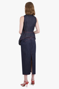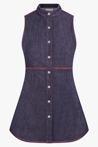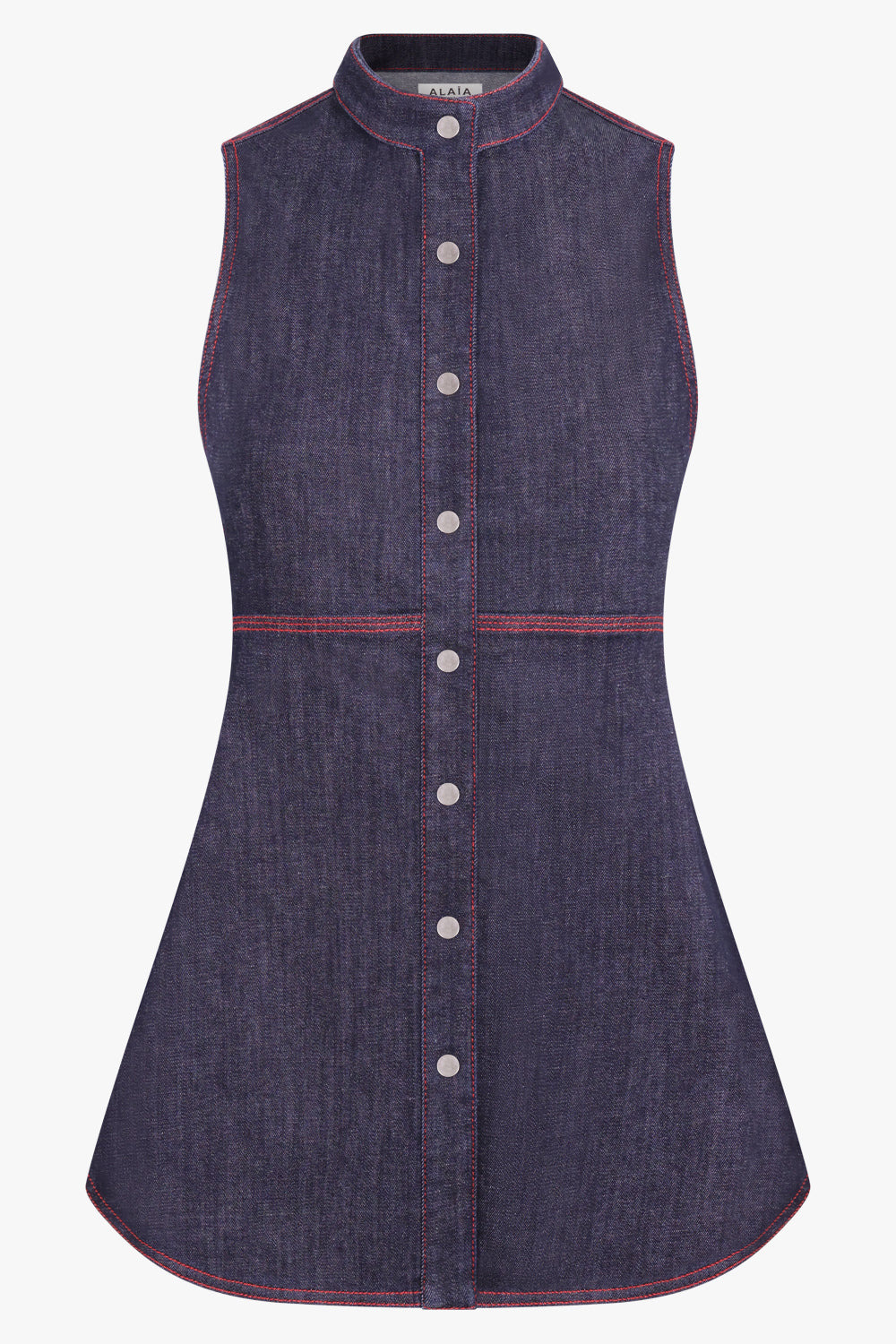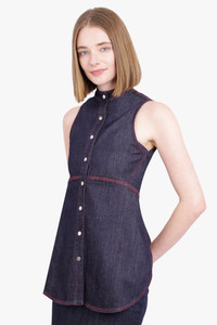 The Alaia Sleeveless Denim Blouse is crafted in a dark wash stretch denim. The style features a high crew neckline and a full length front button closure. The style is fitted to the waistline with an a-line flare finish to the hem. Fabrication: 90% Cotton, 2% Elastane, 8% Polyester Size and Fit Sophie: Model is 179cm/5’10” and is wearing a size FR36 Model Measurements: Bust: 76cm, Waist: 61cm, Hips 87.5cm Fits true to size Measurements 36: Bust 80cm, Waist 74cm, Hip 84cm, Length 109cm 38: Bust 84cm, Waist 78cm, Hip 88cm, Length 109cm 40: Bust 86cm, Waist 80cm, Hip 90cm, Length 72cm
