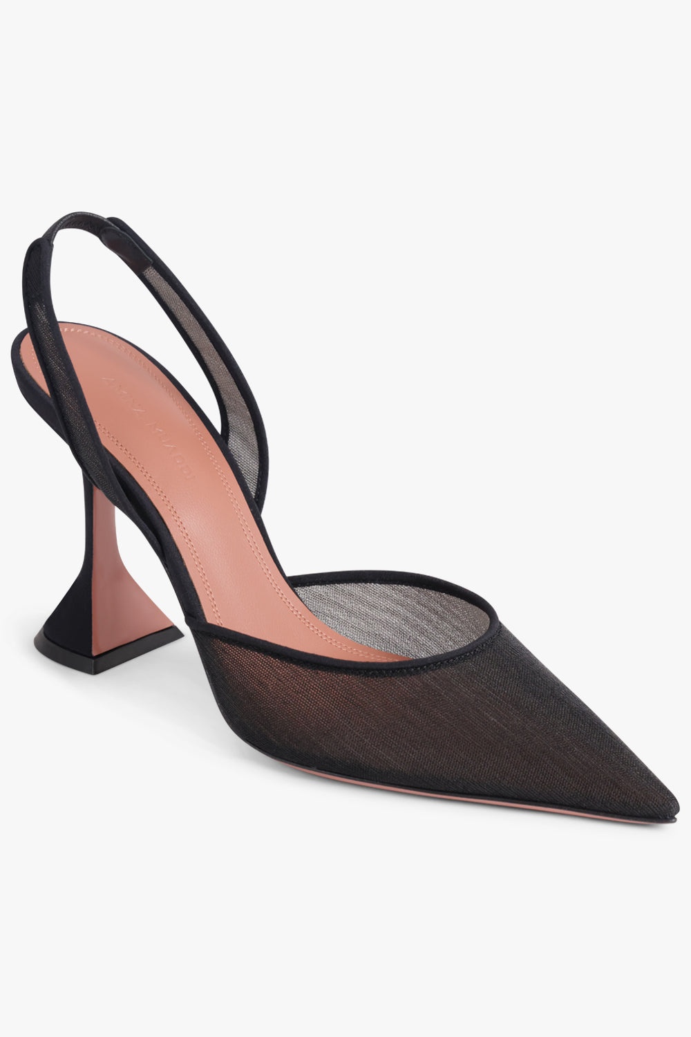 Elegant and architectural, the Holi Mesh 95mm Slingback by Amina Muaddi merges sheer texture with sculptural form. Crafted from black polyester-nylon mesh, the pointed-toe silhouette is refined and elongating. A partially elasticised slingback strap ensures a secure fit, while the brand’s signature splayed heel adds distinctive lift. Finished with nude leather soles, this design balances modern sensuality with precision craftsmanship. Material: 100% Polyester/Nylon Mesh Heel Height: 95mm Pointed toe for a sleek, elongating effect Sheer mesh upper for lightness and texture Iconic Amina Muaddi splayed stiletto heel Partially elasticised slingback strap for comfort and hold Nude leather outsole for contrast and refinement Pair with evening wear or workwear for a bold yet sophisticated finish. Measurements 95mm Heel Height
