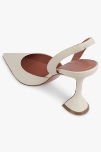 Elegant and architectural, the Amina Muaddi Holli 95 Leather Slingback merges supple texture with sculptural form. Crafted from soft almond leather, the pointed-toe silhouette is refined and elongating. A partially elasticised slingback strap ensures a secure fit, while the brand’s signature splayed heel adds distinctive lift. Finished with nude leather soles, this design balances modern sensuality with precision craftsmanship. - Material: 100% leather - Heel Height: 95 mm - Pointed toe for a sleek, elongating effect - Upper: smooth almond leather for a neutral, refined finish - Iconic Amina Muaddi splayed stiletto heel - Partially elasticised slingback strap for comfort and hold - Nude leather outsole for contrast and refinement Pair with evening wear or workwear for a bold yet sophisticated finish — the neutral leather lends a timeless and versatile elegance to the sculptural silhouette. Size and Fit Italian sizing. This style features a slingback and a pointed toe. If you are between sizes, we recommend sizing down half a size as the slingback offers a slightly more forgiving fit around the heel. Crafted in soft leather, the upper will naturally give to mould to the shape of your foot, but will not stretch with wear. For that reason, we suggest taking your usual size for the best fit. Measurements 95mm Heel Height
