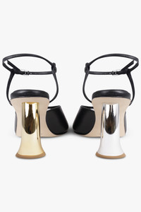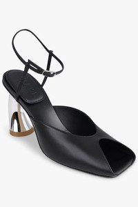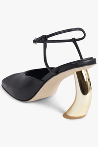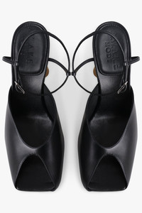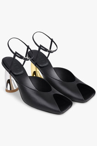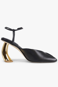 A sleek fusion of minimalism and modern sculptural design, the Guistine Open Square Toe Curved 90mm Heel offers a bold take on classic eveningwear. Crafted from smooth black leather, this heeled sandal features a striking gold-toned rounded metal heel and a clean open square toe. The adjustable ankle strap and buckle fastening ensure a secure and flattering fit. - Fabrication: 100% Leather - Smooth black leather upper - Gold-toned sculptural curved 90mm heel - Open square toe for a modern silhouette - Slim ankle strap with buckle fastening - Cushioned insole for added comfort Pair with a statement dress or tailored ensemble, or complete the look with metallic accessories for a bold, directional style from our Occasion Wear. Size and Fit Fits true to size