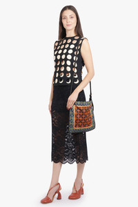 - Fabrication: - 85% Polyester 15% Polyurethane - Cut to a slim silhouette - Round neckline - short sleeves - Layered cut-out detailing throughout - Zip fastening Size and Fit Sophie: Model is 179cm/5’10” and is wearing a size FR36 Model Measurements: Bust: 76cm, Waist: 61cm, Hips 87.5cm French sizing Fits true to size
