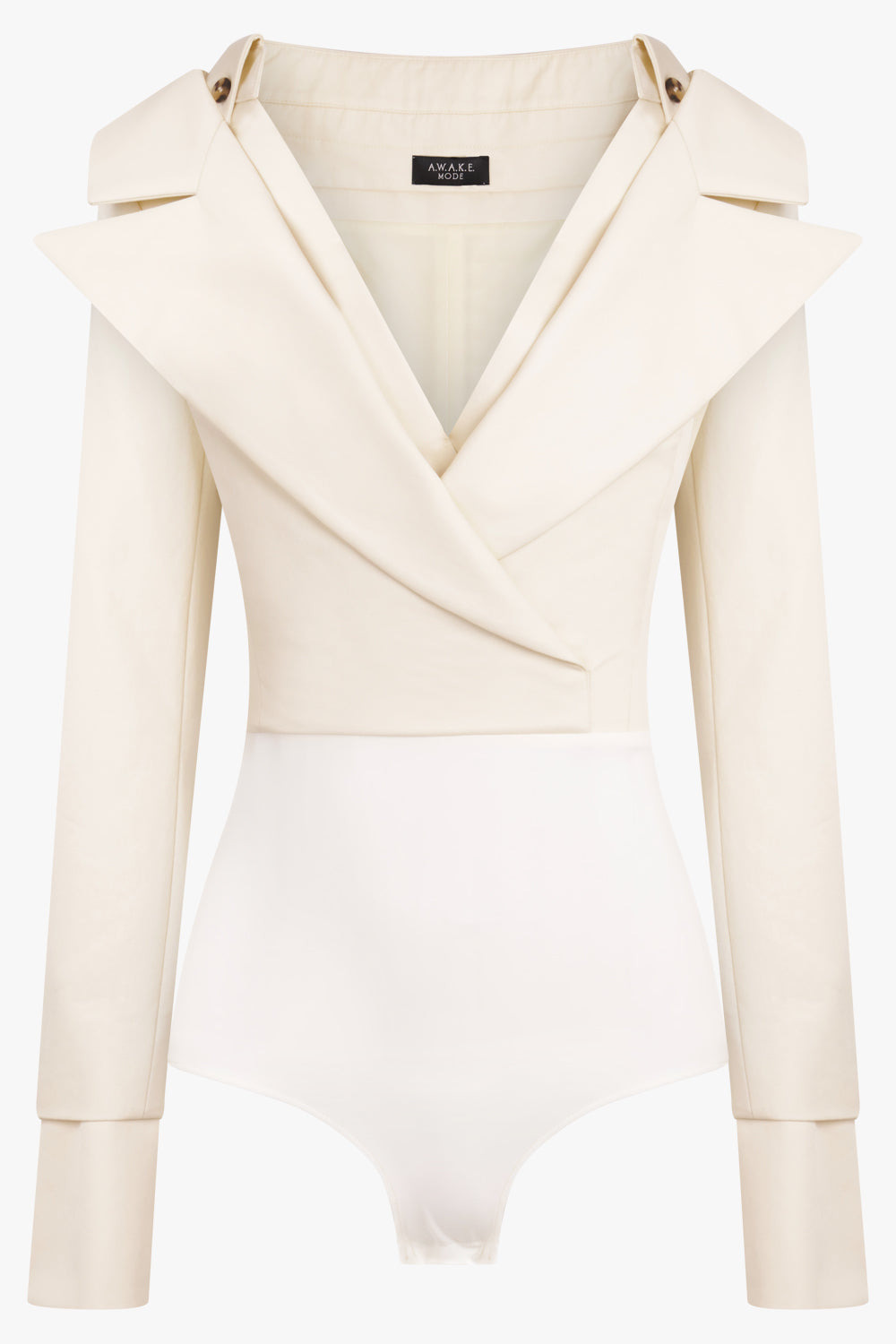 LOW CUT DECOLLETE CROSSOVER SHIRT JACKET DETAIL BODYSUIT | IVORY