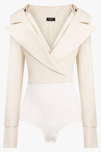 - Fabrication: 100% polyester - Bodysuit with layered jacket look style - Off shoulder lapels - Long sleeves - Cuffed sleeves - Hidden clip fastening Size and Fit Sophie: Model is 189cm/6’02” and is wearing a size FR36 Model Measurements: Bust: 76cm, Waist: 61cm, Hips 87.5cm French sizing Fits true to size Measurements Size 36: Bust 80cm, Waist 66cm, Hip 66cm, Length 71cm Size 38: Bust 82cm, Waist 68cm, Hip 68cm, Length 71cm Size 40: Bust 84cm, Waist 70cm, Hip 70cm, Length 71cm
