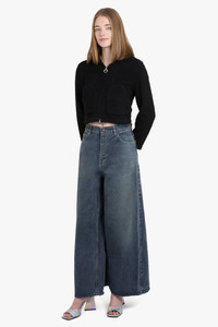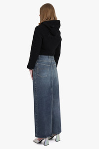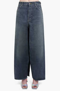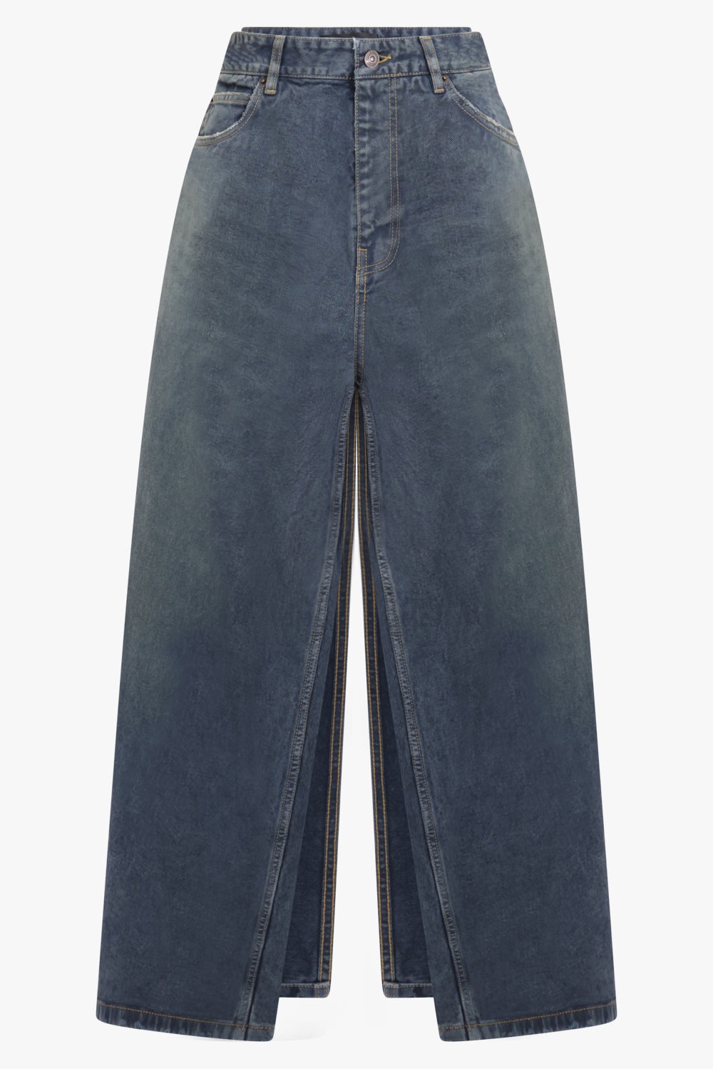 The apron pant skirt features pants at the front and a skirt at the back, including a zipped closure at the side, 5 belt loops, and 5 pockets. With a covered zip fly and a single slit at the back, the hem is frayed for a stylish touch. The floor length design also includes a Balenciaga inlaid patch at the back. Fabrication: 100% Cotton denim Measurements Size XS: Waist 76cm, Hips 96cm, Length 108cm
