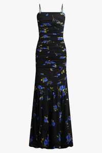 This second-skin maxi dress combines a bold floral animalier print with a floor-length, body-hugging silhouette. The design features a straight neckline and sleeveless cut. A ruffled bodice flows into a full skirt with diagonal ruffles, creating a dramatic sense of movement. The low-cut back enhances the sensual shape, while the zip closure ensures a seamless finish. Fully lined for comfort, this piece balances fluidity and structure. - Fabrication: 90% polyamide, 10% elastane - Second-skin jersey construction - Floral animalier print - Straight neckline with sleeveless cut - Ruffled bodice with diagonal ruffled skirt - Low-cut back - Floor-length design - Zip closure at back - Fully lined - Body-hugging fit Style with strappy heels and a sleek mini clutch for evening events. Size and Fit Tiah: Model is 178cm/5’9” and is wearing a size IT40 Model Measurements: Bust: 86cm, Waist: 69cm, Hips 90.5cm