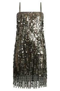 This dazzling mini dress is intricately hand-embroidered with mirrored sequin threads, bugle beads, and floral motifs, creating a striking surface texture that shimmers with movement. The straight silhouette is balanced by a sleeveless cut and low-cut back, while a fringed hemline lends playful fluidity to the finish. Both bold and refined, it embodies standout evening glamour. - Fabrication: 100% Polyamide - Hand embroidery with mirrored sequins, bugle beads, and floral details - Straight silhouette with regular fit - Sleeveless cut with straight neckline - Mini length - Low-cut back - Shoulder pad structure - Fringed hem finish - Please note: This delicate piece features intricate sequin embellishments and should be handled with care. Slight loss of sequins may occur over time due to the nature of the fabric. Style with strappy heels and a sleek mini clutch for evening events. Size and Fit Tiah: Model is 178cm/5’9” and is wearing a size IT38 Model Measurements: Bust: 86cm, Waist: 69cm, Hips 90.5cm