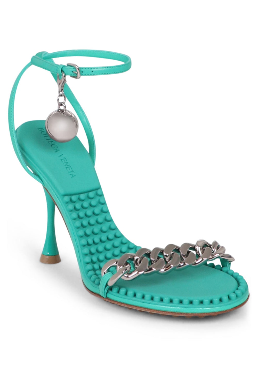 The Bottega Veneta Dot Ankle Strap Sandal is crafted from acid turquoise lambskin and has a 90mm heel. This style features a textured footbed, chain accent, buckle ankle strap, a detachable spherical charm and a leather sole with rubber injections. Note: This style is asymmetric and features only one charm. Fabrication: 100% Lambskin, 100% Leather, 100% Rubber Size and Fit This style fits true to size Italian Sizing Heel Height: 90mm