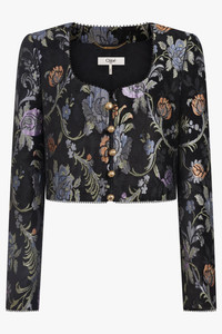 A modern wardrobe essential, the Chloe Floral Scoop Neck Jacket in black/multi captures the house’s signature blend of structure and feminine sophistication. Crafted from floral tapestry jacquard, the jacket combines viscose, polyester, silk, and polyamide for a rich texture with subtle sheen. Featuring a scoop neckline, padded shoulders, and a cropped, structured silhouette, it offers a refined yet contemporary statement. Five gold spherical buttons provide a polished, signature accent. - Fabrication: 50% Viscose, 33% Polyester, 9% Silk, 8% Polyamide - Floral tapestry jacquard with rich texture and subtle sheen - Cropped, structured silhouette with padded shoulders - Scoop neckline for a modern, flattering finish - Five gold spherical buttons as signature Chloe detail - Versatile piece for both polished daytime looks and elevated evening ensembles Style it over the matching mini skirt or tailored trousers for a sophisticated, coordinated silhouette. Size and Fit Tiah: Model is 178cm/5’9” and is wearing a size 38 Model Measurements: Bust: 86cm, Waist: 69cm, Hips 90.5cm Fits true to size Measurements 38: Bust 96cm, Waist 96cm, Length 41cm 40: Bust 98cm, Waist 98cm, Length 41cm 42: Bust 100cm, Waist 100cm, Length 41cm