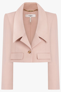 - Fabrication: lower-impact wool gabardine - Structured, conscious design - Cropped silhouette for a modern, feminine shape - Long sleeves with tailored buttoned cuffs for a polished finish - Statement wide notched lapel with front collar detail for elevated edge - Front flap pockets for subtle structure and function - Single front button closure with a refined tortoiseshell effect - Fully lined for comfort and a smooth drape - Soft clay pink tone for a fresh, versatile neutral look Size and Fit Sophie: Model is 179cm/5’10” and is wearing a size FR36 Model Measurements: Bust: 76cm, Waist: 61cm, Hips 87.5cm French sizing Fits true to size