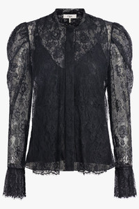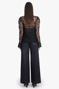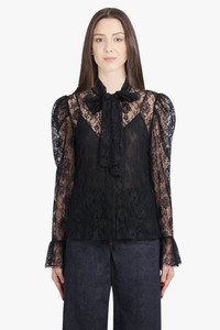 This floral lace blouse channels sensitivity and strength through its sheer jacquard construction and precisely detailed silhouette. The lavalliere neck tie adds a note of soft drama, while puffed shoulders and flared cuffs bring a sense of sculptural romance. A removable silk-blend tank offers coverage and layering versatility. - Fabrication: - Exterior: 100% Polyamide - Independent Lining: 68% Acetate Fiber, 32% Silk - Buttons: 100% Mother-of-Pearl - Long sleeves with flared cuffs - Sheer jacquard lace with floral motif - Lavalliere neck tie with soft drape - Puffed shoulders for structured volume - Concealed front placket with mother-of-pearl buttons - Includes separate silk-blend tank lining for coverage Crafted in collaboration with Akanjo, a long-time Chloe partner and OMCE-certified social enterprise in Madagascar committed to craftsmanship, equality, and well-being. This piece exemplifies powerful sensitivity and the elevation of everyday elegance, pair with a Chloe bag to finish the look.