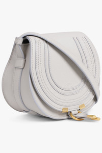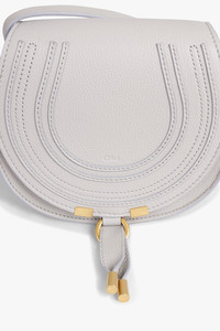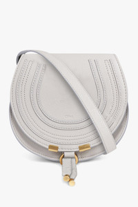 The Chloe Marcie Small Bag is a structured grained calfskin shoulder bag. True to the iconic Marcie line, this practical and compact bag combines a distinct 70's spirit with a romantic, bohemian touch. The harmonious mix of a clean top-line and round silhouette is typical of the Maison's play on masculine and feminine notes.It features a foldover flap with cinch fastening at main compartment, embossed logo and concealed welt pocket at face. The luxurious small grain calfskin is embellished with saddle stitches for equestrian appeal, while the glint of brass hardware and dangling tassel bring a feminine flourish. Product Details: The strap can be adjusted to wear it across the body or on the shoulder. Fabrication: 100% Calfskin Leather Measurements Width: 19cm, Height: 18cm, Depth: 10.5cm